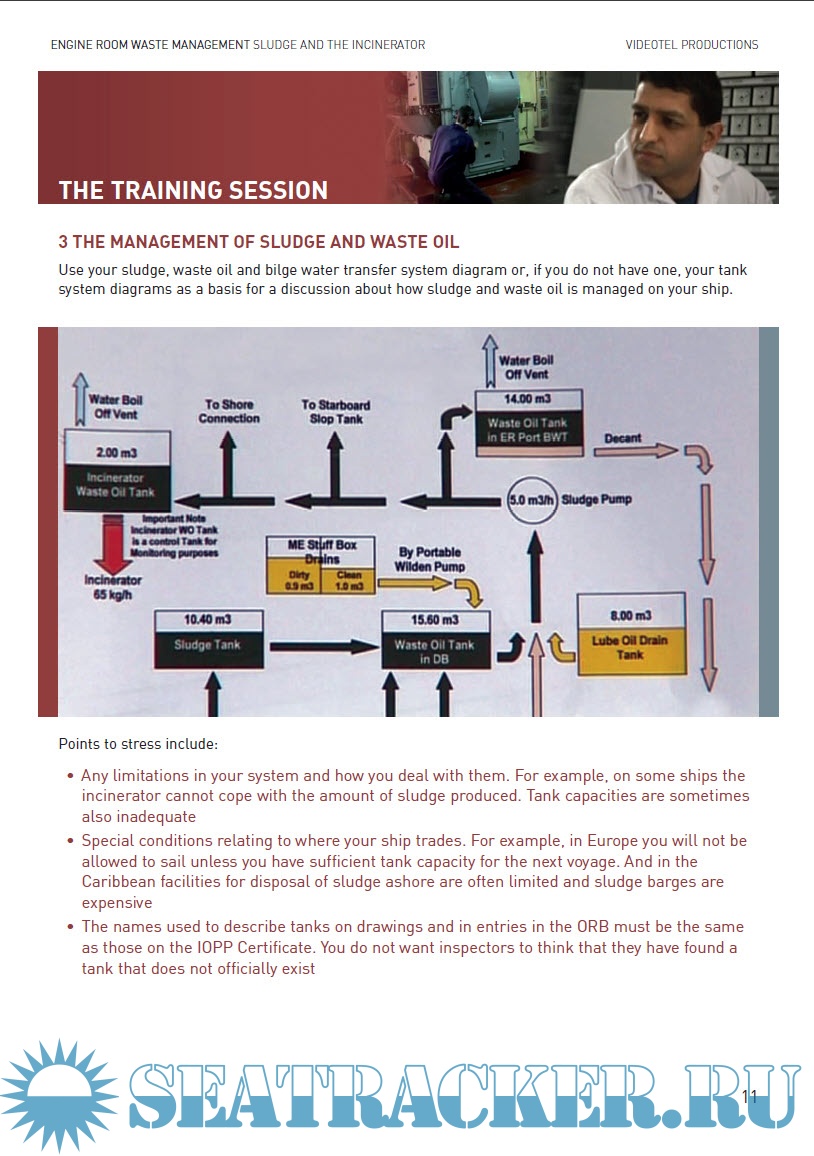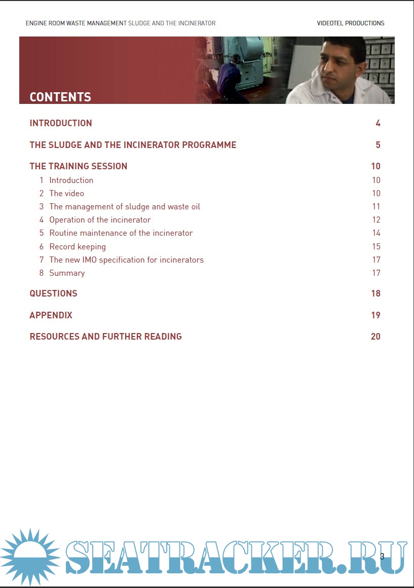 Year: 2007 Language: english Author: Pat Mitchell Genre: Guide Publisher: VIDEOTEL Format: PDF Quality: eBook Pages count: 24 Description: OBJECTIVES The guide will enable an engineer officer such as yourself to use the video as the basis for a short training session for a small group of engine room personnel. Those taking part will: • Review the regulations governing the discharge of sludge and garbage and the use of the incinerator • Identify and review the management of sludge and waste oil on board • Understand the procedure for using the incinerator • Review the procedure for routine maintenance of the incinerator • Understand the records which must be kept on the disposal of sludge and garbage • Understand key features of the new IMO specification for shipboard incinerators • Relate the general points raised in the video to the management of sludge and the use of the incinerator on their own ship