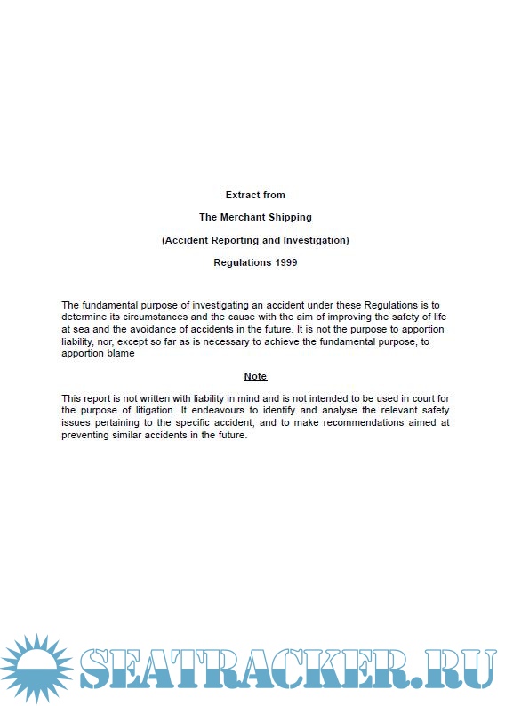 Year: 2004 Language: english Author: Marine Accident Investigation Branch Genre: Textbook Publisher: MAIB Edition: 1 Format: PDF Quality: Unknown Pages count: 52 Description: Extract from The Merchant Shipping (Accident Reporting and Investigation) Regulations 1999 The fundamental purpose of investigating an accident under these Regulations is to determine its circumstances and the cause with the aim of improving the safety of life at sea and the avoidance of accidents in the future. It is not the purpose to apportion liability, nor, except so far as is necessary to achieve the fundamental purpose, to apportion blame Note This report is not written with liability in mind and is not intended to be used in court for the purpose of litigation. It endeavours to identify and analyse the relevant safety issues pertaining to the specific accident, and to make recommendations aimed at preventing similar accidents in the future.