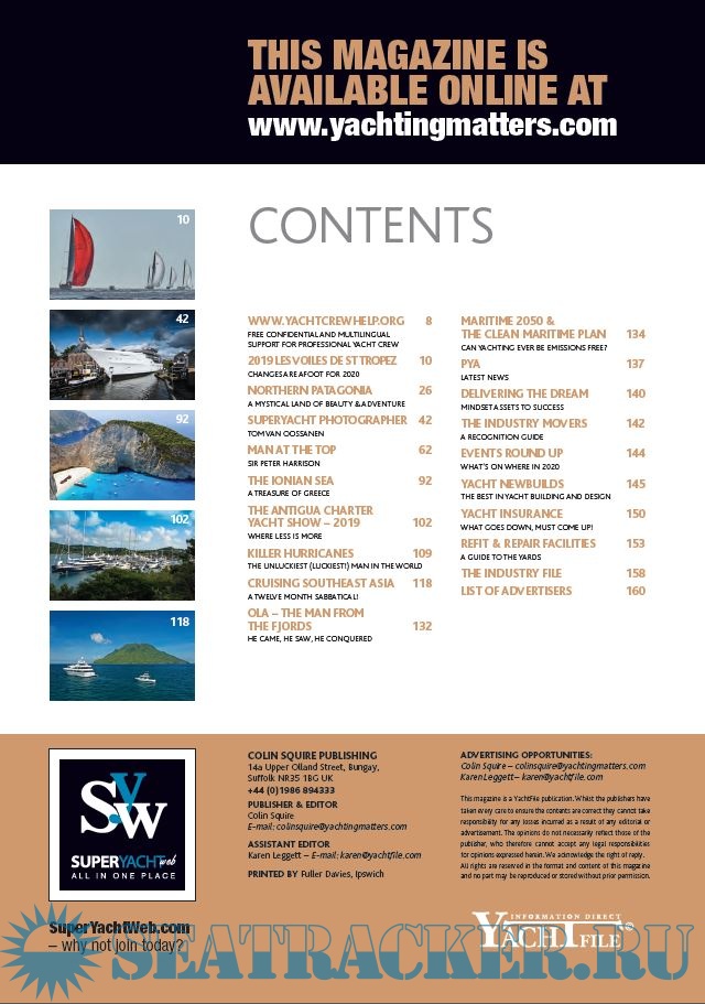 Year: 2020 Language: english Author: Yachting Matters Genre: Periodical (magazine) Format: PDF Quality: eBook Pages count: 143 Description: In 2000 the first edition of Yachting Matters was published and hand delivered, free, to large yachts alongside the YachtFile pack. This high quality bi-annual publication has since grown to become one of, if not the best, Superyacht magazine published today, both in quality and content.
