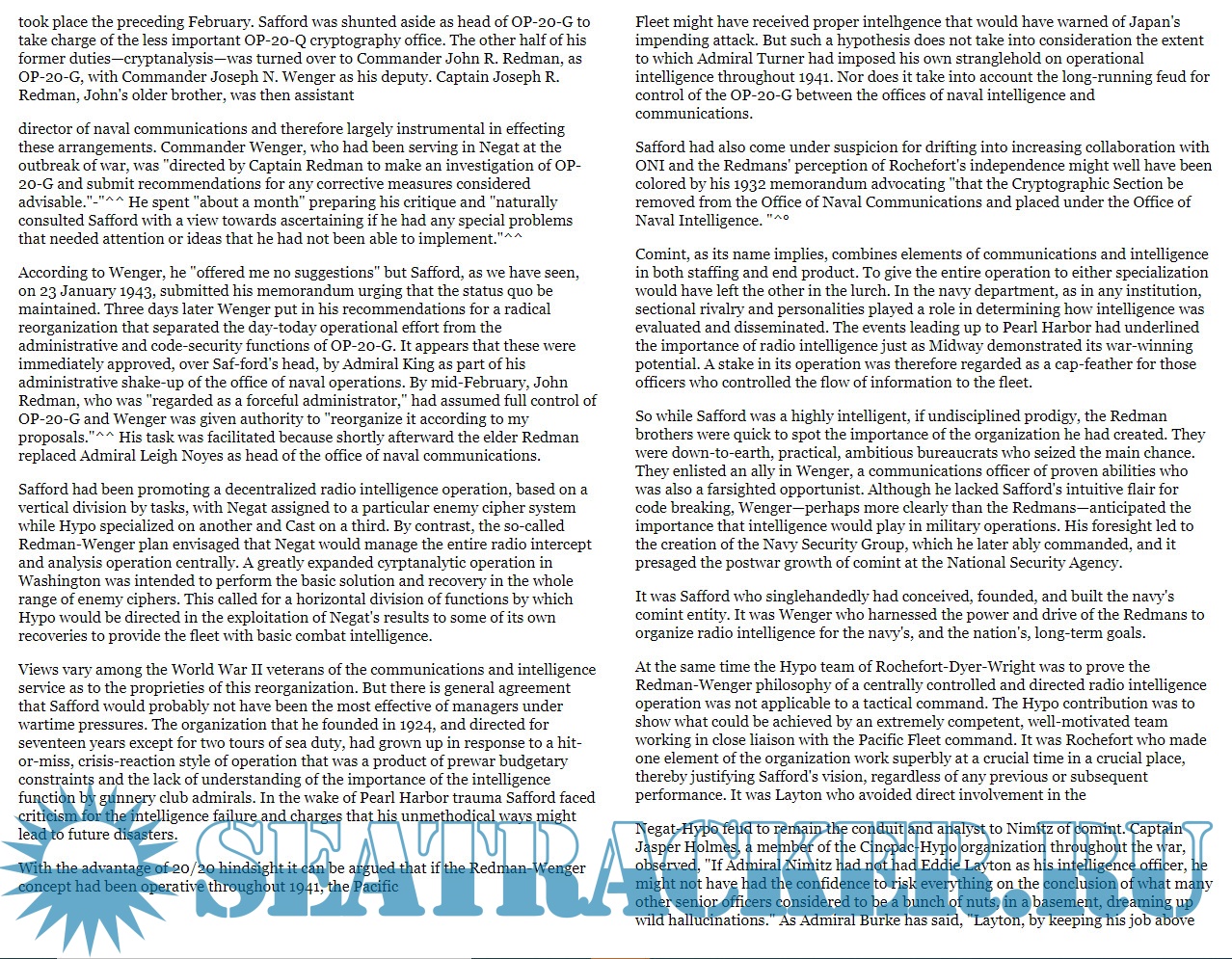 The book details how these selfish actions to destroy Rochefort alerted the Japanese to our code breaking success, which had the direct result of keeping US forces in the dark to Japanese intentions regarding the Guadalcanal operation that immediately followed.