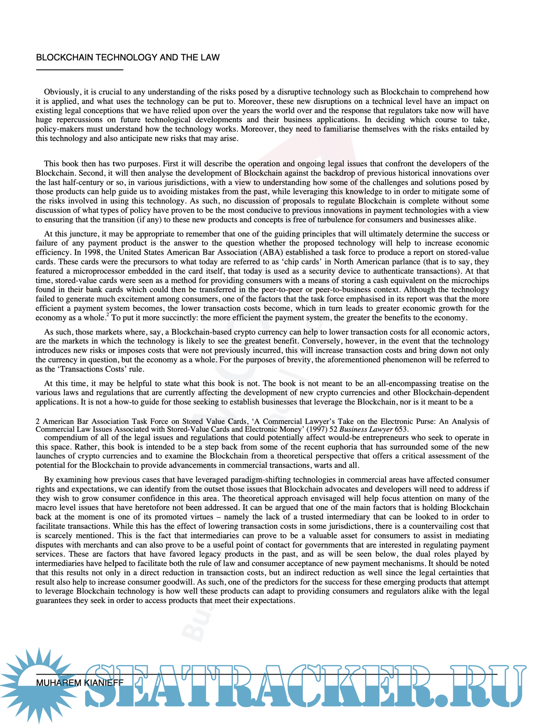 Year: 2019 Language: english Author: Muharem Kianieff Genre: Textbook Publisher: Informa Law Edition: 1st ISBN: 978-1-351039222 Format: PDF Quality: Scanned pages Pages count: 121 Description: This book has two purposes. First it will describe the operation and ongoing legal issues that confront the developers of the Blockchain. Second, it will then analyse the development of Blockchain against the backdrop of previous historical innovations over the last half-century or so, in various jurisdictions, with a view to understanding how some of the challenges and solutions posed by those products can help guide us to avoiding mistakes from the past, while leveraging this knowledge to in order to mitigate some of the risks involved in using this technology. As such, no discussion of proposals to regulate Blockchain is complete without some discussion of what types of policy have proven to be the most conducive to previous innovations in payment technologies with a view to ensuring that the transition (if any) to these new products and concepts is free of turbulence for consumers and businesses alike. Additional info: No index