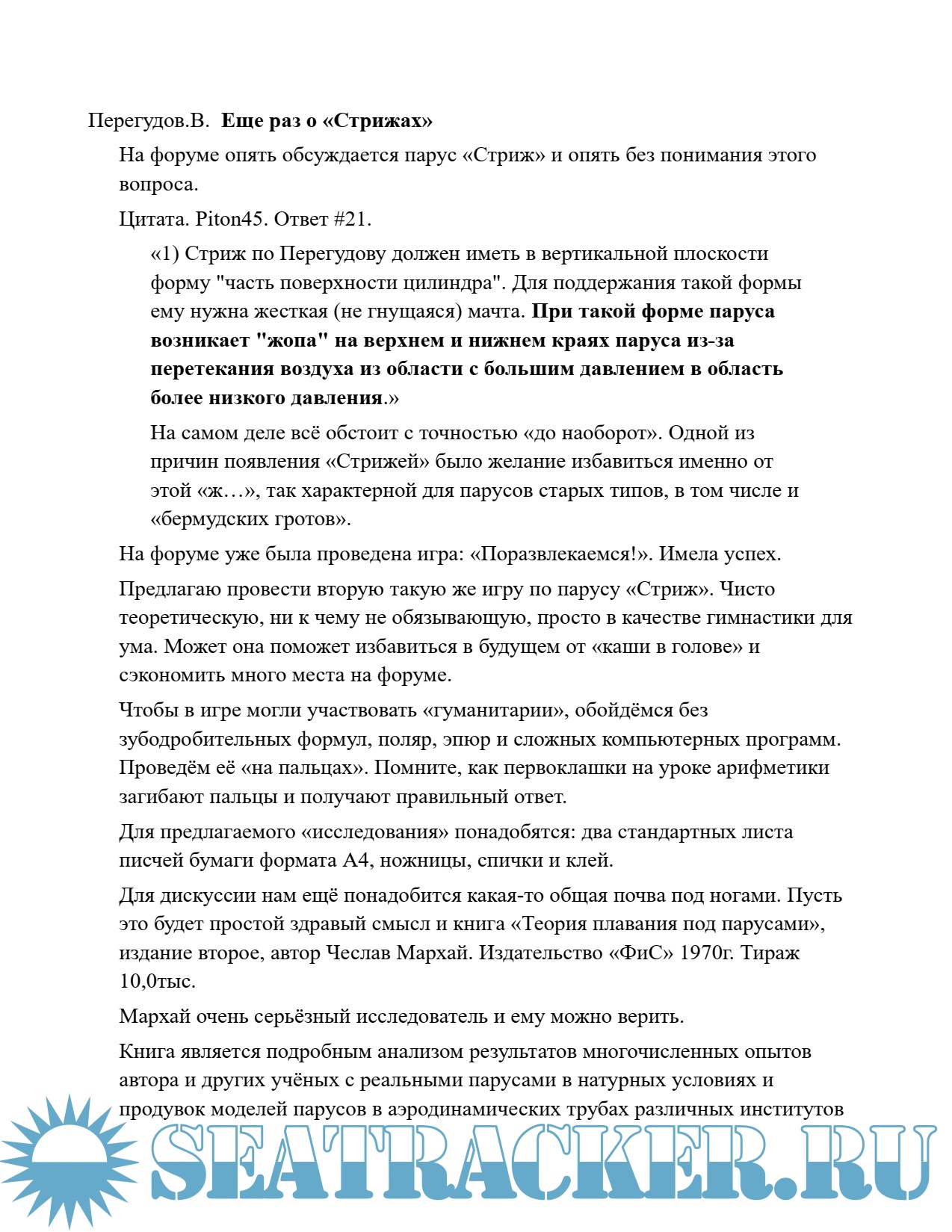 Год выпуска: ? Язык: русский Автор: Перегудов. В. Жанр: Руководство Издательство: ? Формат: PDF/DOCX Качество: Изначально компьютерное (eBook) Количество страниц: 15 Описание: На форуме опять обсуждается парус «Стриж» и опять без понимания этого вопроса. Цитата. Piton45. Ответ #21. «1) Стриж по Перегудову должен иметь в вертикальной плоскости форму "часть поверхности цилиндра". Для поддержания такой формы ему нужна жесткая (не гнущаяся) мачта. При такой форме паруса возникает "жопа" на верхнем и нижнем краях паруса из-за перетекания воздуха из области с большим давлением в область более низкого давления.» На самом деле всё обстоит с точностью «до наоборот». Одной из причин появления «Стрижей» было желание избавиться именно от этой «ж…», так характерной для парусов старых типов, в том числе и «бермудских гротов».