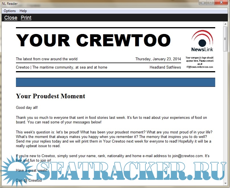 Description: Keep your crew up to date with news from home and around the world, provided by NEWSlink,™ the leading international news service for seafarers. NEWSlink delivers daily news reviews, updates and special interest items in video, audio, and text, with content from a wide range of countries and languages.