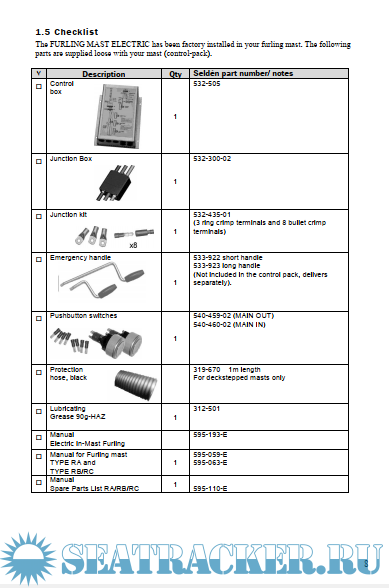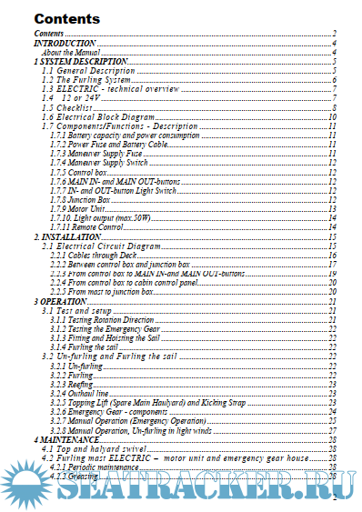 Год выпуска: 2014 Язык: английский Автор: Seldén Group Жанр: Руководство Издательство: Seldén Group Формат: PDF Качество: Отсканированные страницы + слой распознанного текста Количество страниц: 52 Описание: INTRODUCTION About the Manual To obtain the maximum benefit and enjoyment from your Seldén FURLING MAST ELECTRIC we recommend that you study this manual carefully. The manual is divided into four sections. One is a GENERAL DESCRIPTION of the system and of the included electrical and mechanical parts. The second section is dealing with INSTALLATION (the electrical components) of a system mounted on a new furling mast, and the third one describes how to OPERATE the system. The fourth section is about MAINTENANCE, and finally the fifth section describes installation of a FURLING MAST ELECTRIC unit on an F-mast already equipped with a Seldén manual furling system. This manual is a supplement to the “Manual for Furling Mast TYPE RA” (595-059-E) and “Manual for Furling Mast TYPE RB Mk II/RC Mk II” (595-063-E). The appropriate manual is included in your FURLING MAST ELECTRIC-documentation. To install and operate the system both this manual and the actual manual mentioned above, are required. This manual covers FURLING MAST ELECTRIC RA(12V), RB(12V), RC(12&24V) Доп. информация: МАТЕРИАЛ ВЫЛОЖЕН ИСКЛЮЧИТЕЛЬНО В ОЗНАКОМИТЕЛЬНЫХ ЦЕЛЯХ! Другие мои раздачи: https://seatracker.ru/tracker.p...id=13371#results