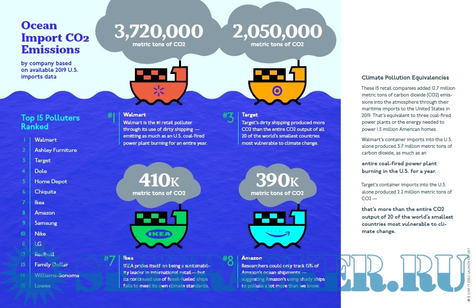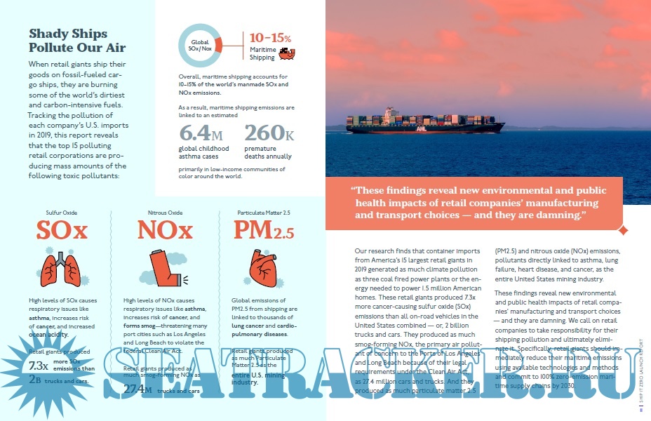 Description: Retail giants have outsourced the manufacturing of consumer products for decades. This has driven significant growth in fossil-fueled maritime shipping. Backed by Big Oil, fossil-fueled maritime shipping is so cheap that it helps justify corporations’ production of goods overseas. The world’s shipping fleet has quadrupled in size since the 1980s to keep up with demand. Globally, the environmental and public health impacts of shipping’s rise are massive. Each year, the shipping industry produces one billion metric tons of climate emissions, causes 6.4 million childhood asthma cases, and contributes to 260,000 premature deaths. Data on specific companies’ contributions to these global numbers, however, is relatively unknown. Pacific Environment and Stand.earth produced this report to improve public understanding and oversight of corporate responsibility for shipping industry emissions. We sought out to determine which retail companies are responsible for the greatest levels of fossil-fuel pollution because of their annual maritime imports. Using publicly available national import data and never-before-used rigorous research and verification methods, we identified the fifteen retail companies that produce the highest levels of climate and air pollution as a result of their maritime imports to the United States.