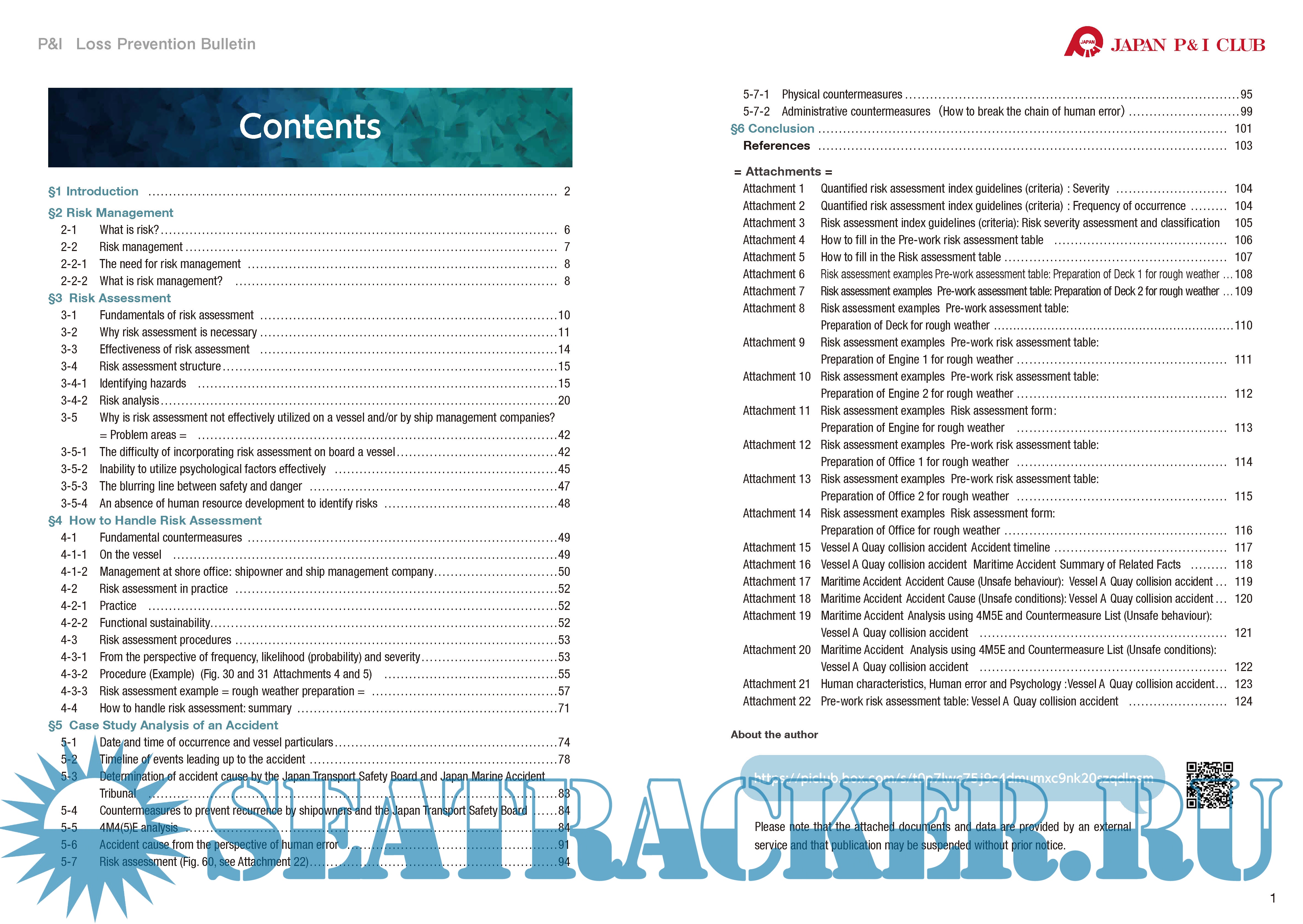 Year: 2021 Language: english Author: Japan P&I Club Format: PDF Quality: eBook Pages count: 128 Description: This Bulletin "Risk Assessment in Practice" refers to the reason why risk assessment is not effectively utilized on a vessel and/or by ship management companies. Issued June 2021 Vol. 51