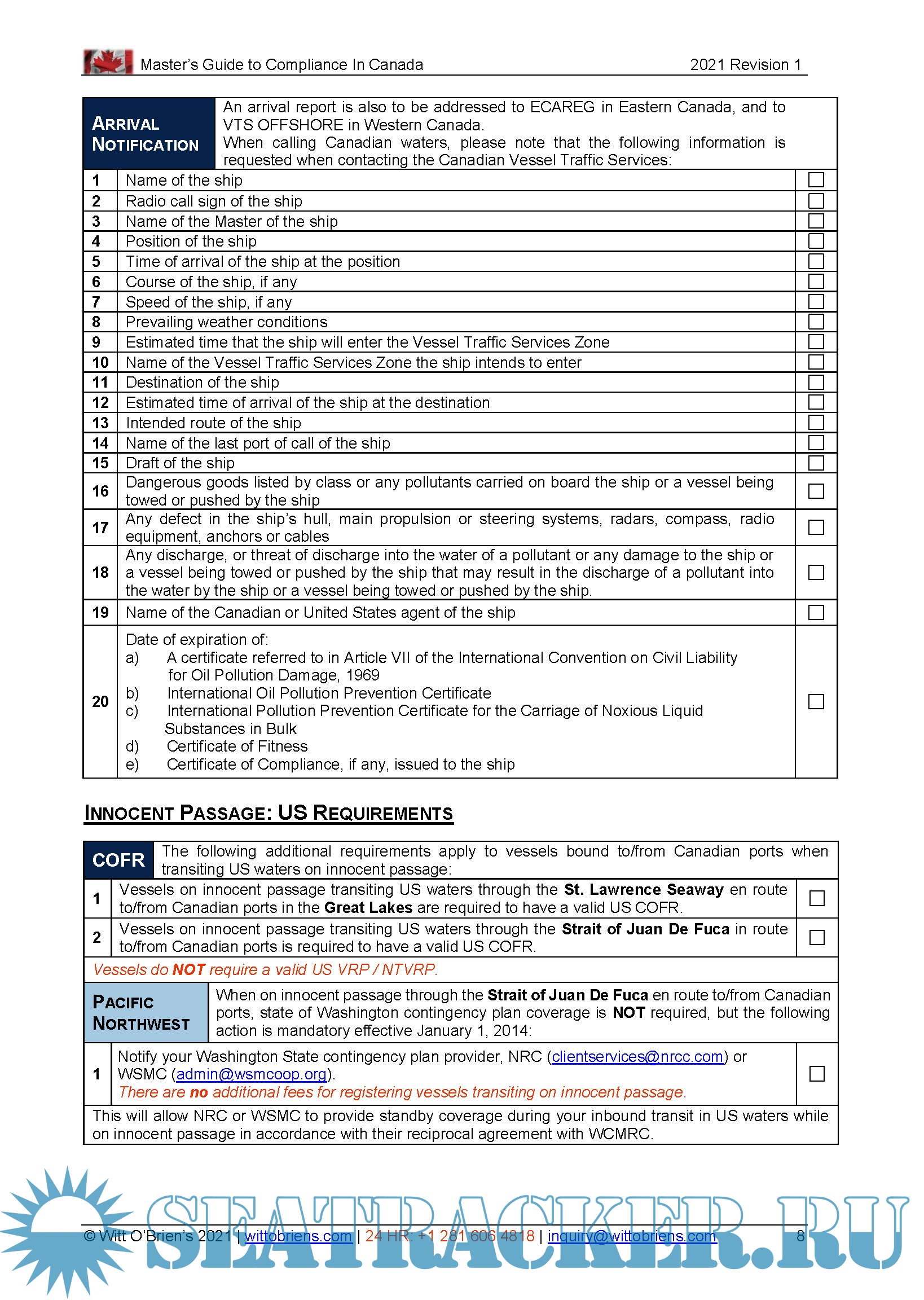 This is a practical guide for Masters to assist in compliance with Canadian laws and regulations. It is not an “official” document and is not required for compliance. It is intended to provide useful direction for Masters. It does not replace any document required by law or regulation. It does not replace direction provided by the ship’s owner/manager/operator. This guide may be modified as required to be in harmony with policies of the owner/manager/operator.