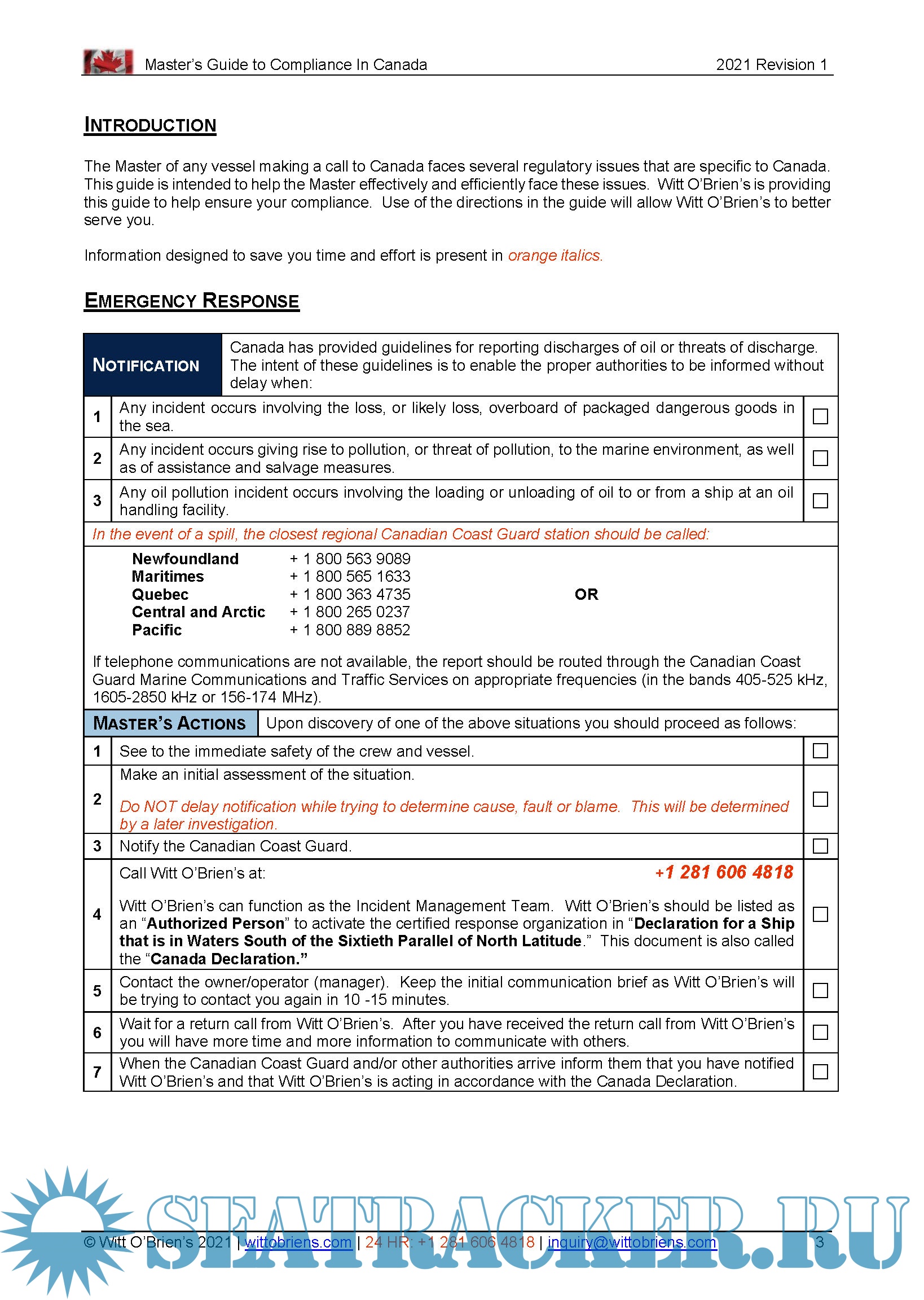 The Master of any vessel making a call to Canada faces several regulatory issues that are specific to Canada. This guide is intended to help the Master effectively and efficiently face these issues. Witt O’Brien’s is providing this guide to help ensure your compliance. Use of the directions in the guide will allow Witt O’Brien’s to better serve you.