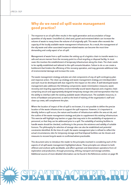 Year: 2014 Language: english Author: IPIECA - IOGP Genre: Guide Format: PDF Quality: eBook Pages count: 52 Description: The response to an oil spill often results in the rapid generation and accumulation of large quantities of oily waste. Emulsified oil, oiled sand, gravel and entrained debris can increase the volume of waste to many times the volume of oil originally spilt
