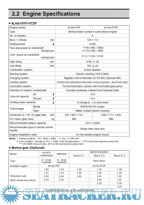 Year: 2017 Language: english Author: YANMAR Diesel Engine Co. Ltd Japan Genre: Manual Format: PDF Quality: eBook Pages count: 466 Description: Yanmar Marine Diesel Engine 4LHA- Variants Operation and Maintenance Manual in different PDFs. Specifications Rated Output - 177 kW / 240 mhp Rated Speed - 3300 rpm Displacement - 3.455 L / 211 cu. in No. of cylinders - 4 cylinders Cylinder Bore x Stroke - 100 mm x 110 mm / 3.94 in x 4.33 in Combustion system -Direct Injection, In-line Pump Aspiration - Turbocharged & Intercooled Alternator - 12V - 80A Dry weight without gear - 365 kg / 805 lbs Dimensions - 1131 mm x 719 mm x 811 mm Controls - Mechanical