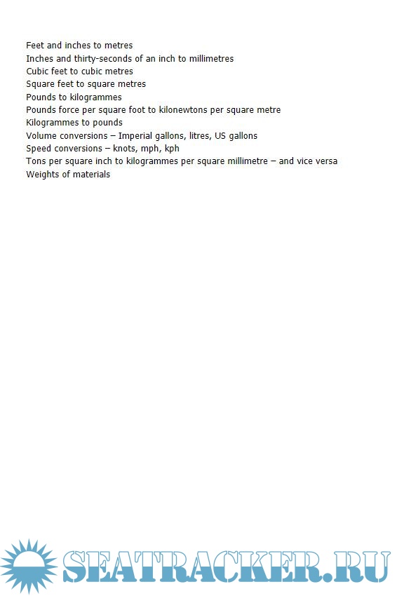 This seventh edition has been updated throughout and is now in colour for the first time. It contains more tables of lengths, widths, weights and strengths as well as new data on a vast range of equipment from anchors to masts, propellers to gas cylinders, cleat sizes to winch bases, and hatches to bolts, bearings, cabling and piping.