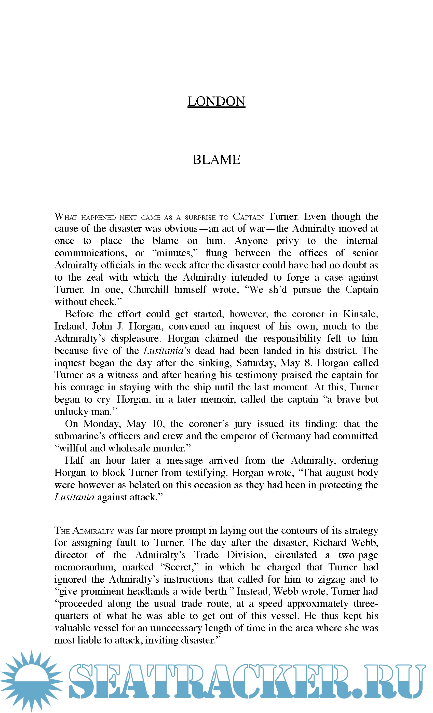 Description: On May 1, 1915, with WWI entering its tenth month, a luxury ocean liner as richly appointed as an English country house sailed out of New York, bound for Liverpool, carrying a record number of children and infants. The passengers were surprisingly at ease, even though Germany had declared the seas around Britain to be a war zone. For months, German U-boats had brought terror to the North Atlantic. But the Lusitania was one of the era’s great transatlantic “Greyhounds”—the fastest liner then in service—and her captain, William Thomas Turner, placed tremendous faith in the gentlemanly strictures of warfare that for a century had kept civilian ships safe from attack.
