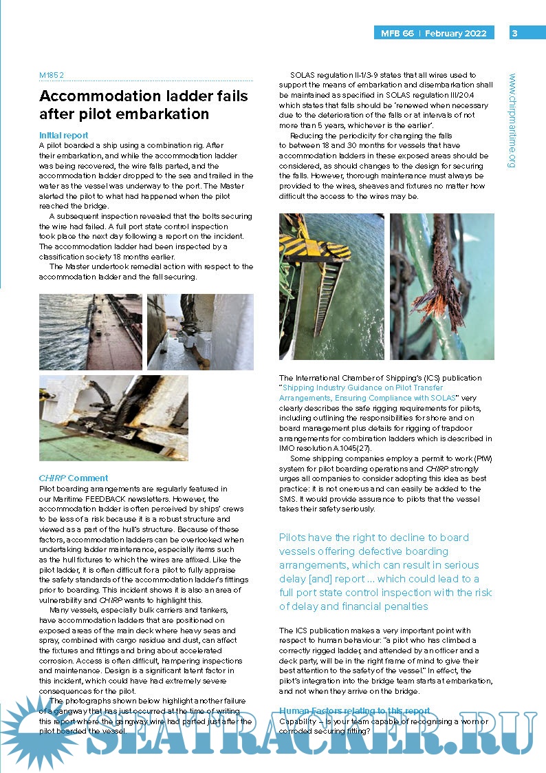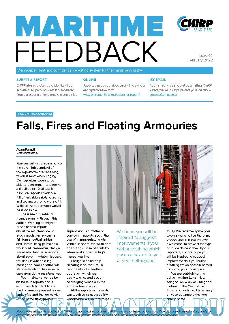 Year: 2021-2022 Language: english Author: CHIRP Maritime Genre: Periodical (magazine) Edition: issues 65/21 - 66/22 Format: PDF Quality: eBook Pages count: total 20 Description: An independent and confidential reporting system for the maritime industry. The Confidential Hazardous Incident Reporting Programme (CHIRP) Maritime reviews and investigates reports of hazardous incidents and near misses by providing an independent and confidential reporting system for the maritime industry. Britannia sponsors the translation of the quarterly CHIRP Maritime Feedback (MFB) into Filipino, aimed at improving Filipino seafarers’ understanding of CHIRP Maritime and to encourage them to report issues such as safety breaches, environmental issues, sexual harassment, bullying and health concerns. All notifications are handled in total confidence
