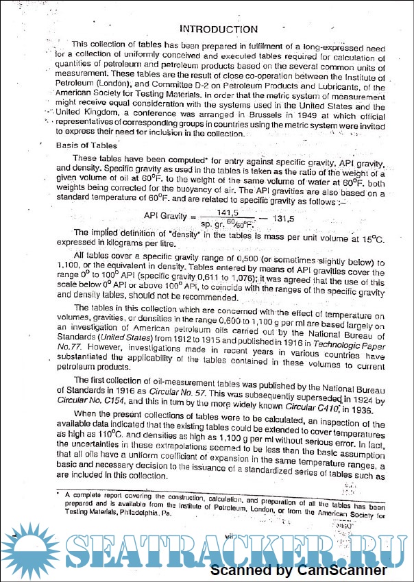 Year: 2003 Language: english Author: Bhandarkar Publications Genre: Reference book Publisher: Bhandarkar Publications Format: JPEG Quality: Photo of pages Pages count: 43 Description: This collection of tables has been prepared in fulfillment of a long expressed need for a collection of uniformily conceived and executed tables required for calculation of quantities of petroleum and petroleum products based on the several common units of measurement. These tables are the result of the close co-operation between the Institute of Petroleum (London) and committee D-2 on Petroleum products and lubricants, of the American Society for Testing materials. In order that the metric system of measurement might recieve equal consideration with the systems used in the United States and the United Kingdom, a conference was arranged in Brussels in 1949 at which official representatives of corresponding groups in countries using the metric system were invited to express their need for inclusion in the collection. Additional info: Selected pages of ASTM tables as permitted by the Directorate General of Shipping, India for examination purpose only.