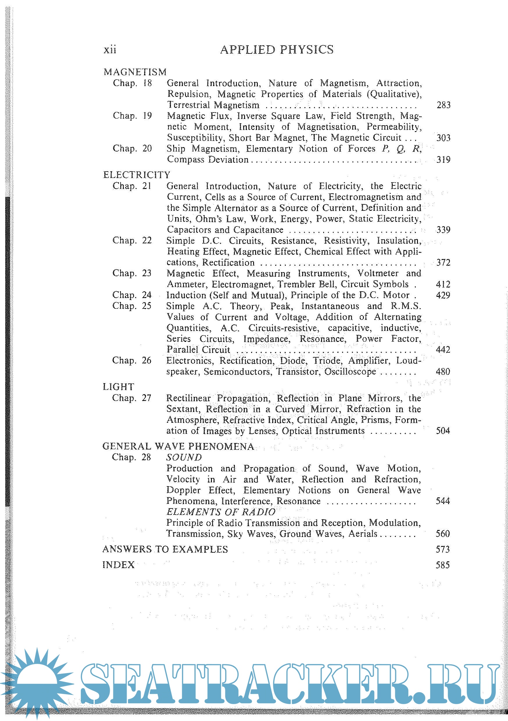 Year: 1994 Language: english Author: J.H. Clough-Smith Publisher: Brown, Son and Ferguson Ltd Edition: 5th ISBN: 9780851746241 Format: PDF Quality: Scanned pages Pages count: 614 Description: This 5th edition contains many changes from previous editions, with the removal of many obsolete units and their replacement with S.I. units. Some chapters have been almost completely rewritten whilst others have had new additional material added. The book as in previous editions does not claim to be a general textbook on physics, or mechanics, or hydrostatics but is written with a view to cover the syllabus of General Science for the examinations of Deck Officer Class 3 certificate. There are 28 chapters covering Statics - Hydrostatics - Dynamics - Heat - Light - Sound -Magnetism and Electricity. Worked examples are demonstrated and past examination questions are to be found at the end of each chapter. The book as it now stands will be found suitable for all readers studying for the Applied Science and Mathematics examinations. Additional info: https://www.skipper.co.uk/catalogue/item/applied-physics