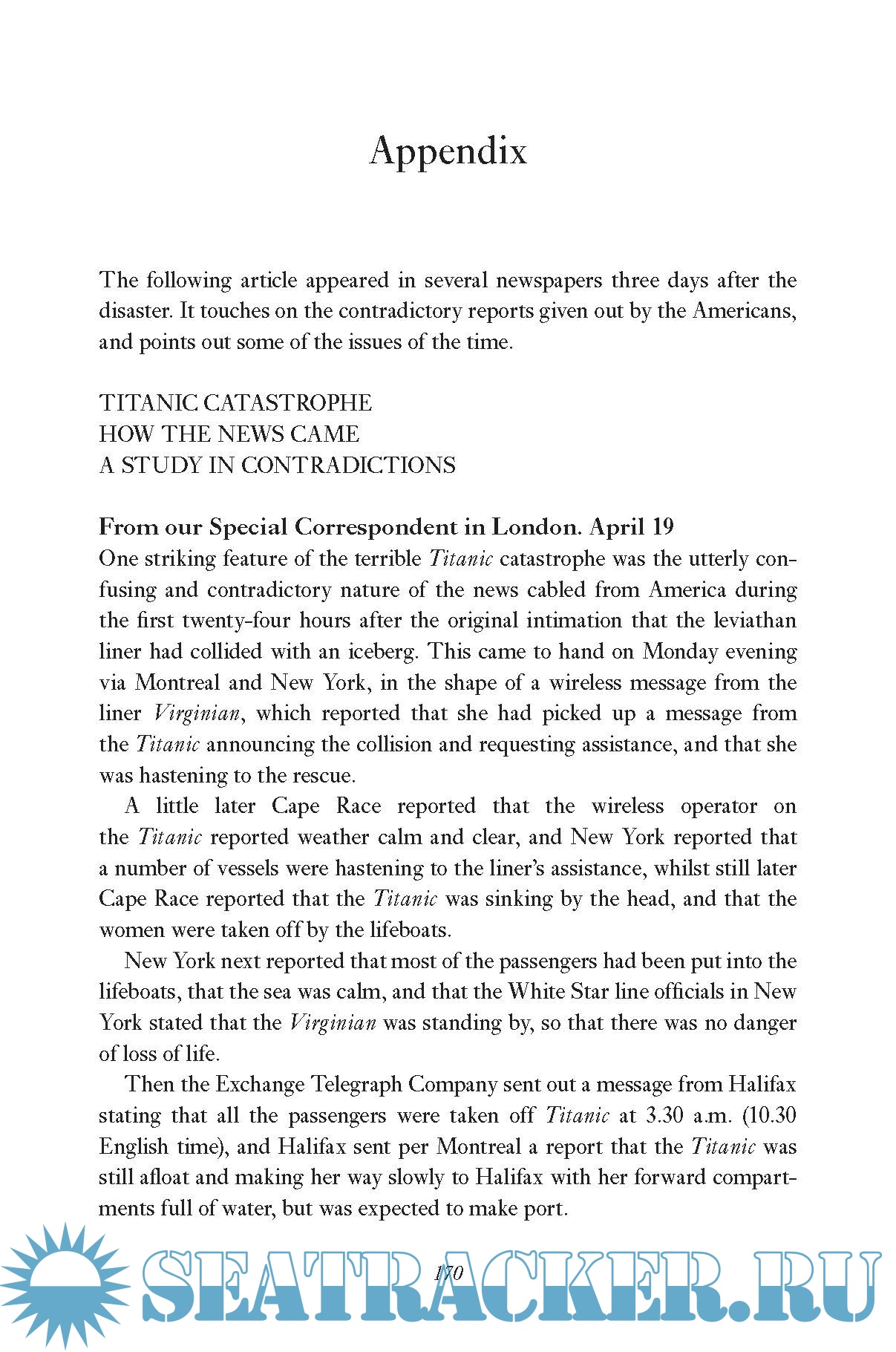Much has been written about the Titanic disaster, and it has been the subject matter for several films. The author is well-known for his depth of research and his attention to detail, and in a new style of format, he has selected fifty people involved in the disaster, and by using their specific eyewitness accounts he has managed to make the confusing situation much clearer, making it possible for the reader to experience the dreadful events as they unfolded. The book also includes biographical tributes to the fifty people, who came from all walks of life and geographical regions, telling who they were, their experiences during the disaster, and what happened to those who were fortunate enough to survive.