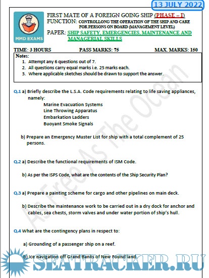 Question Paper Set for Ship Safety & Emergencies (July 2022) for Phase I (Chief Mate F.G.) Mercantile Marine Department (MMD), India Examinations