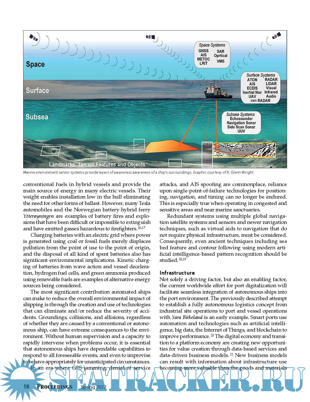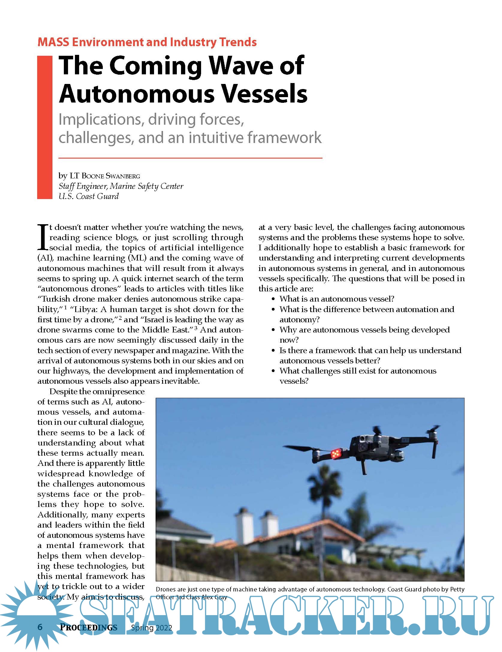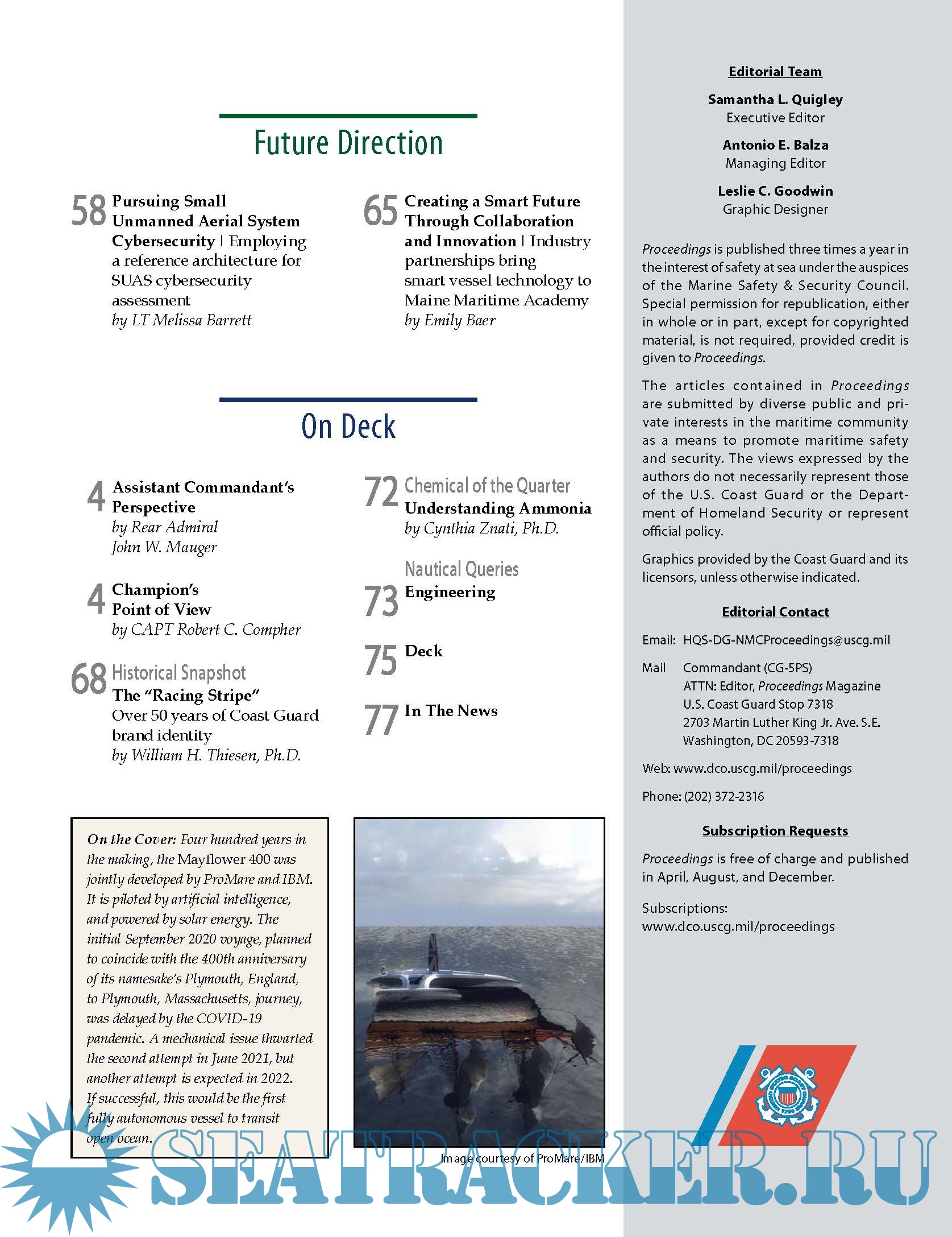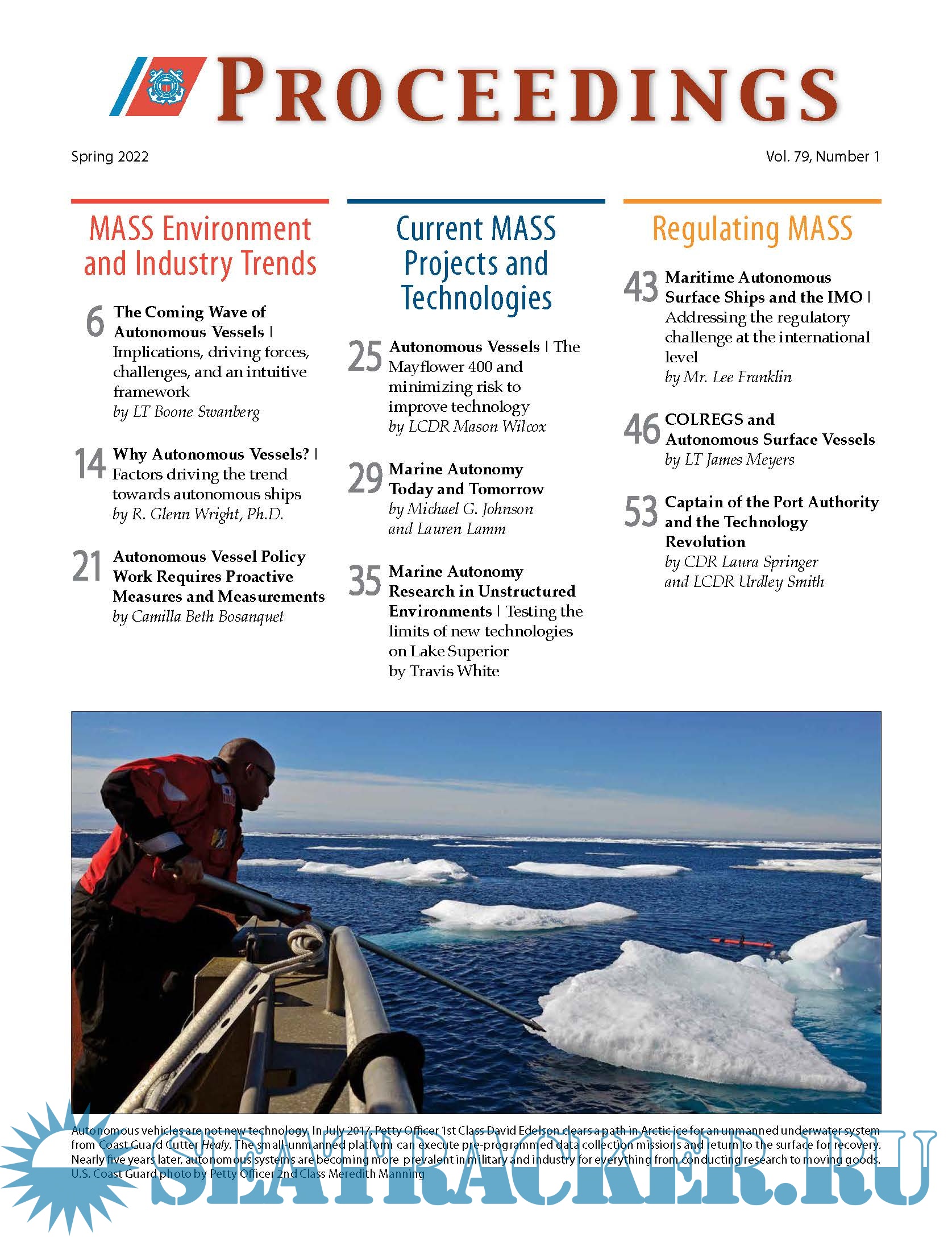 Year: 2022 Language: english Author: USCG Genre: Periodical (magazine) Format: PDF Quality: eBook Pages count: 80 Description: Proceedings of the Marine Safety & Security Council, the Coast Guard Journal of Safety at Sea, is the voice of the Coast Guard’s Marine Safety and Security Council. It began publication in 1944 and, over the decades, has reached an increasing level of recognition among the larger maritime industry and Coast Guard personnel. Currently, over 30,000 copies of Proceedings are mailed out each issue. Proceedings’ audience includes a large segment of the private maritime industry population, including retired officers, fishing vessel captains, river pilots, ocean scientists, marine engineers, tug/tow boat operators, shipping executives, insurance operators, and maritime lawyers. Other subscribers include U.S. Coast Guard and U.S. Navy personnel, mariners, reservists, Departments of Homeland Security and Transportation staff, and allied foreign national readers. The U.S. Coast Guard publishes Proceedings three times a year. Each edition of Proceedings-typically 80 to 100 pages-features a specific theme and is championed by a Coast Guard office, assigned based on the command’s expertise in that area. Recent themes have included: The 21st Century Maritime Workforce; Recreational Boating Safety; Waterways: America's Economic Engine; Safety Management Systems; and Improving Maritime Safety. Additional info: Volume 79 No.1|issue Spring 2022 - Uncharted Waters : Navigating the integration of autonomous vessels