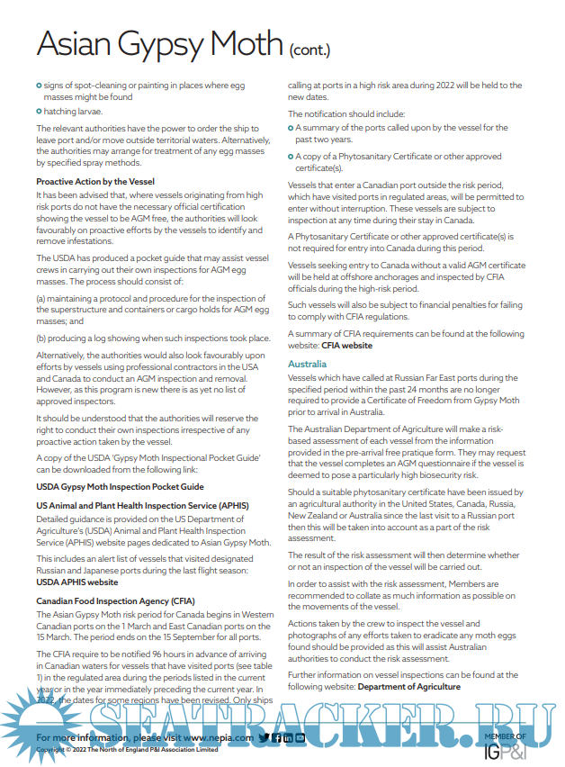Year: 2022 Language: english Author: NORTH Genre: Practical guide Edition: 2022 Format: PDF Quality: Scanned pages Pages count: 7 Description: Asian Gypsy Moth is the collective name given to a group of insects including the Lymantria dispar asiatica, Lymantria dispar japonica, Lymantria umbrosa, Lymantria postalba and Lymantria albescens varieties. These insects are found predominantly in eastern Russia, northern China and some parts of northern Japan. During the summer, there is a strong possibility they will lay eggs on visiting ships which will then inadvertently carry them to other parts of the world. The problem is that in their larval stage, when they look like caterpillars, the moths are big eaters of all types of plant leaves. The USA, Canada, Australia, New Zealand, Chile and Argentina are thus particularly concerned at the damage Asian gypsy moths might cause to their major forestry and fruit industries. This briefing provides an update of the various restrictions in force in these countries.