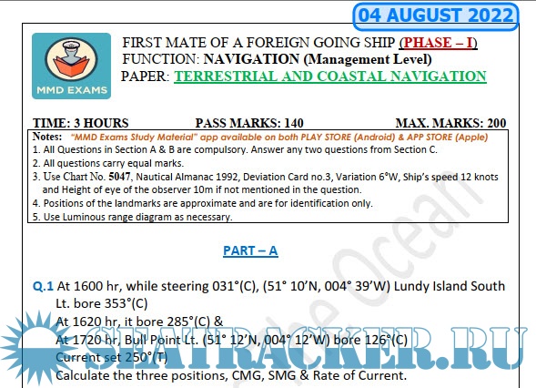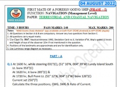 Question Paper Set for Terrestrial and Celestial Navigation (August 2022) for Phase I (Chief Mate F.G.) Mercantile Marine Department (MMD), India Examinations