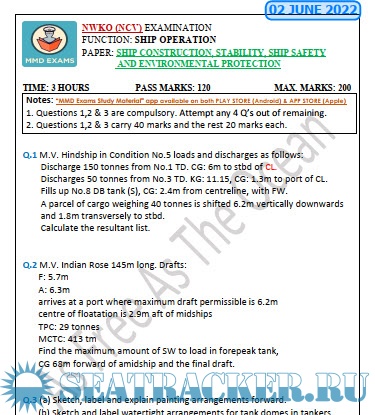 Question Paper Set for Ship Construction, Stability, Ship Safety & Environmental Protection (June 2022) for NWKO (NCV) Mercantile Marine Department (MMD), India Examinations