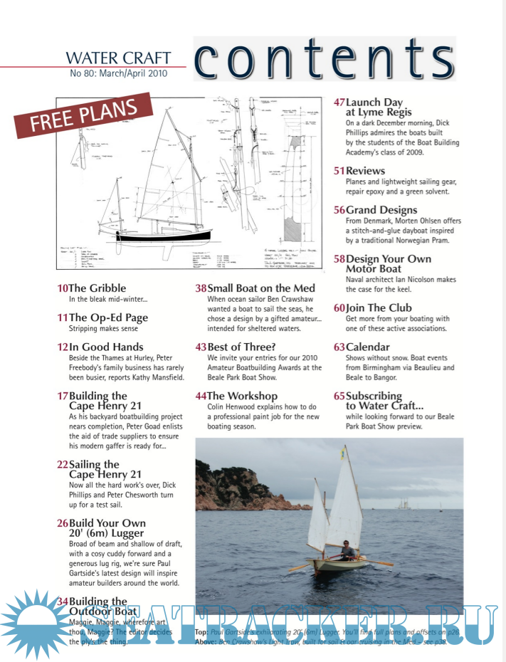 Year: 2010 Language: english Author: watercraft Genre: Periodical (magazine) Format: PDF Quality: Unknown Pages count: 84 Description: watercraft magazine no 80with plans for a centreboard lugger - if you would like more issues please message