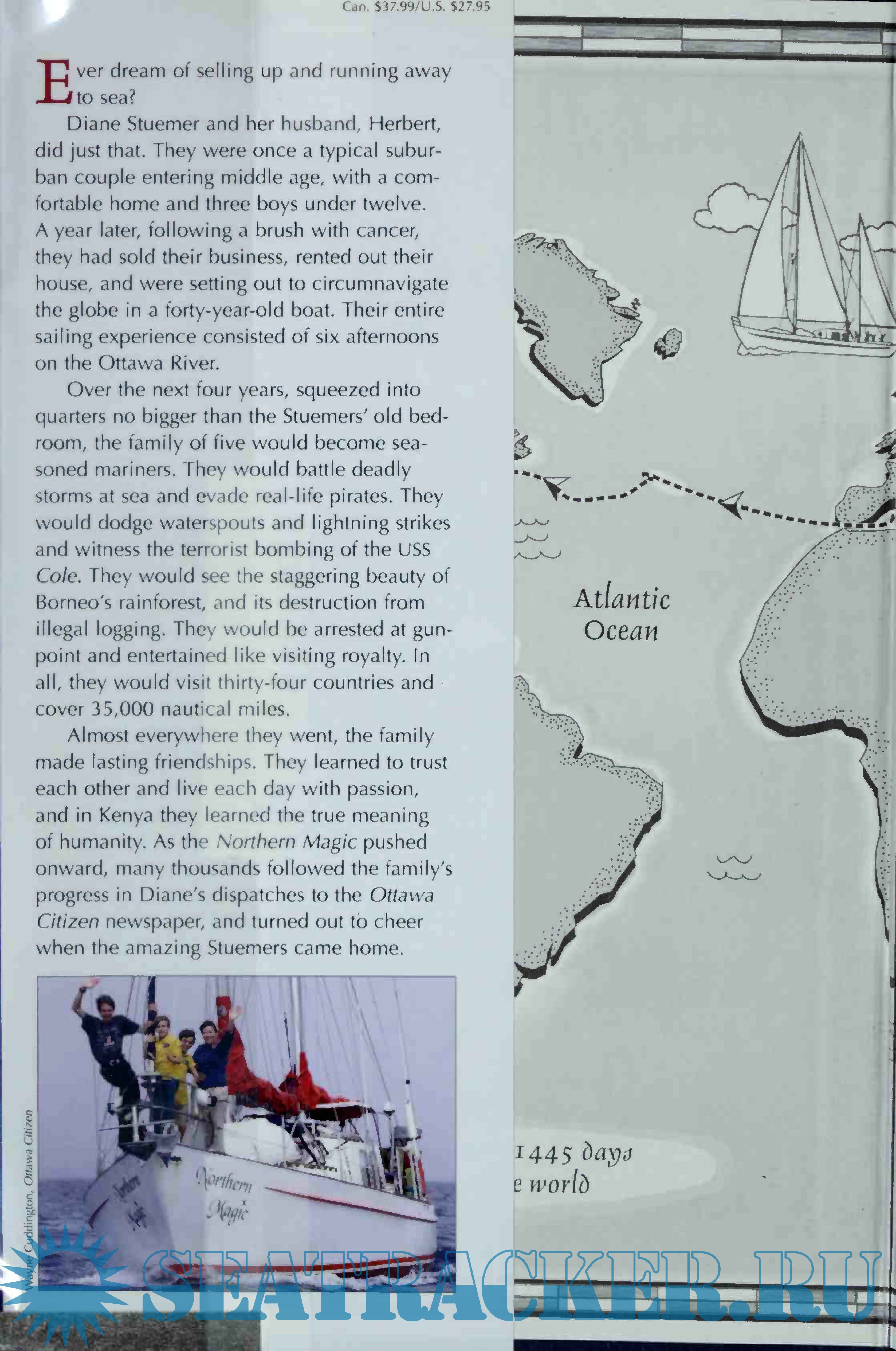 Year: 2004 Language: english Author: Diane Stuemer Genre: Textbook Publisher: McClelland & Stewart Edition: First Format: PDF Quality: Scanned pages Pages count: 399 Description: Ever dream of selling up and running away to sea? Diane Stuemer and her husband, Herbert, were once a typical suburban couple entering middle age, with a comfortable home and three boys under twelve. A year later they had sold their business, rented out their house, and were setting out to circumnavigate the globe in a 40-year-old yacht. Their entire sailing experience consisted of six afternoons on the Ottawa River. Over the next four years, squeezed into quarters no bigger than the Stuemers’ old bedroom, the family of five would become seasoned mariners. They would battle deadly storms at sea and evade real-life pirates. Dodge waterspouts and lightning strikes and witness the bombing of the USS Cole. See the staggering beauty of Borneo’s rainforest, and its destruction from logging. Be arrested at gunpoint and entertained like visiting royalty. In all, they would visit 34 countries and cover 35,000 nautical miles. Almost everywhere they went, the family made lasting friendships. They learned to trust each other and embrace opportunity, and in Kenya they learned the true meaning of humanity. As Northern Magic pushed onward, many thousands followed the family’s progress in Diane’s dispatches to the Ottawa Citizen, and thousands more turned out to cheer when the amazing Stuemers came home.