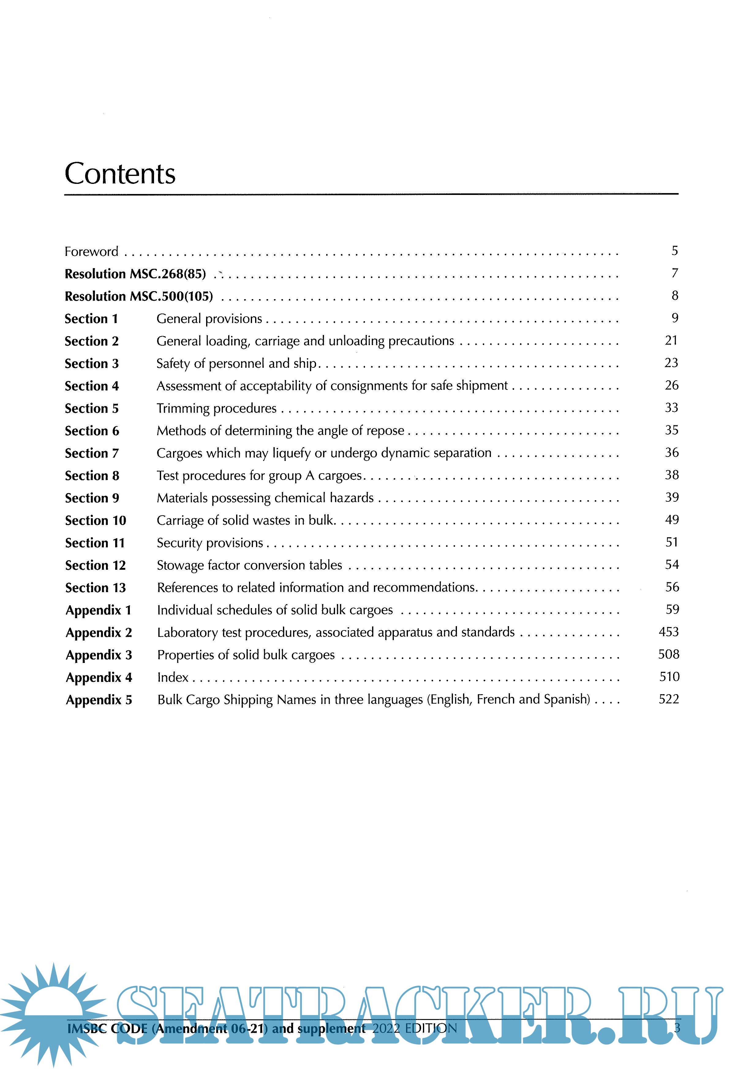 Year: 2022 Language: english Author: IMO Genre: Convention (rules) Publisher: IMO Edition: 2022 ISBN: 978-92-801-1746-2 Format: PDF Quality: Scanned pages + OCR Pages count: 737 Description: The primary aim of the International Maritime Solid Bulk Cargoes Code (IMSBC Code), which replaces the Code of Safe Practice for Solid Bulk Cargoes (BC Code), is to facilitate the safe stowage and shipment of solid bulk cargoes by providing information on the dangers associated with the shipment of certain types of solid bulk cargoes and instructions on the procedures to be adopted when the shipment of solid bulk cargoes is contemplated. The IMSBC Code, adopted on 4 December 2008 by resolution MSC.268(85), entered into force on 1 January 2011, from which date it was made mandatory under the provisions of the SOLAS Convention. The Code has been amended by resolutions adopted by the Maritime Safety Committee, the most recent being resolution MSC.500(105), incorporating Amendment 06-21, which may be applied from 1 January 2023 on a voluntary basis, and has an official entry into force on 1 December 2023. In order to keep pace with the expansion and progress of industry, the IMSBC Code, as amended, includes: • Modifications to various existing individual schedules for solid bulk cargoes. • New individual schedules for such cargoes as ammonium nitrate based fertilizer, ammonium nitrate based fertilizer MHB, clam shell, leach residue containing lead and superphosphate (triple, granular). • New definitions (including an updated definition for group A cargoes), references and requirements for cargoes which may undergo dynamic separation. This publication presents additional information to supplement the IMSBC Code, such as the Code of Practice for the Safe Loading and Unloading of Bulk Carriers (BLU Code), the Manual on loading and unloading of solid bulk cargoes for terminal representatives (BLU Manual) and recommendations on the safe use of pesticides in ships applicable to the fumigation of cargo holds. It also includes a directory of contact names and addresses of offices of designated national competent authorities responsible for the safe carriage of grain and solid bulk cargoes. The IMSBC Code and supplement is commended to Administrations, shipowners, shippers and masters and all others concerned with the standards to be applied in the safe stowage and shipment of solid bulk cargoes, excluding grain.
