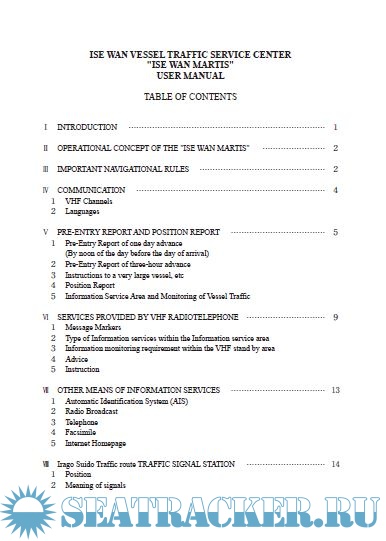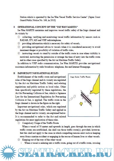 Year: 2011 Language: english Author: Japan Coast Guard Genre: Manual Publisher: JCG Format: PDF Quality: eBook Pages count: 32 Description: Ise Wan Vessel Traffic Service Center, "Ise Wan MARTIS", whose mission is to maintain and improve safety and efficiency of vessel traffic in the Irago channel and its vicinity, has been established and operated by Japan Coast Guard. This User manual aims at contributing to safe navigation of vessels by explaining about services provided by "Ise Wan MARTIS" and essential information while navigating in the Irago channel and its vicinity. Vessels navigating in the Irago channel are highly recommended to carry this manual in the bridge and utilize as a reference book.