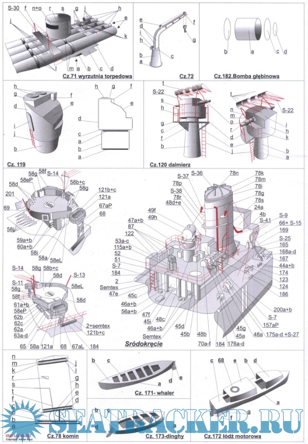24 листа цветных выкроек и инструкций для изготовления бумажной модели эсминца HMS Saumarez (Великобритания) в масштабе 1:200