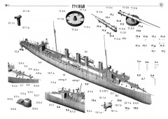 Описание: 11 листов цветных выкроек и инструкций для изготовления бумажной модели эсминца Грозный 1904 год в масштабе 1:200