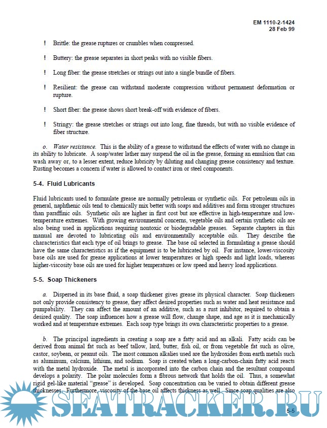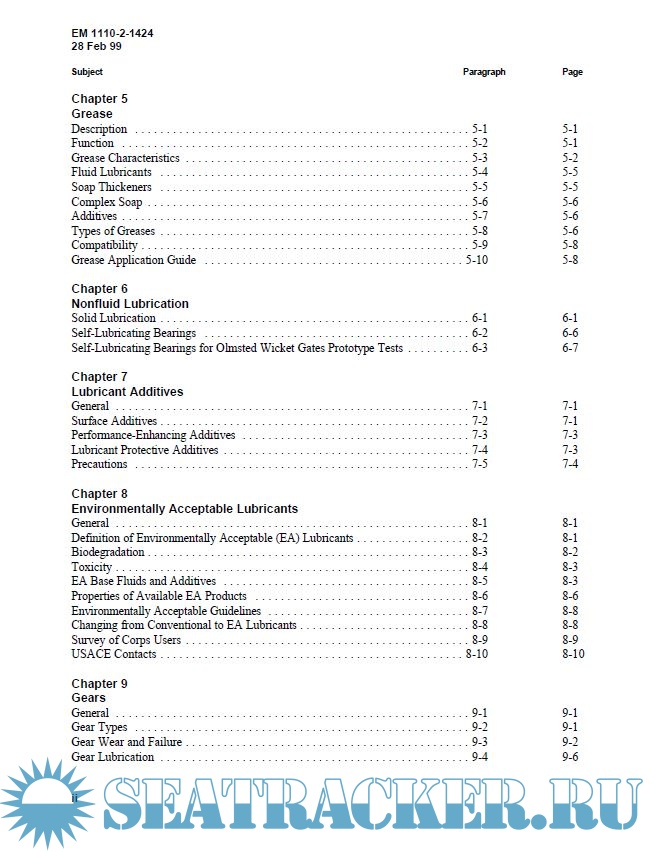 Year: 1999 Language: english Author: U.S. Army Corps of Engineers Genre: Manual Format: PDF Quality: Scanned pages + text layer Pages count: 197 Description: This manual is intended to be a practical guide to lubrication with enough technical detail to allow personnel to recognize and easily discern differences in performance properties specified in manufacturers’ product literature so that the proper lubricant for a particular application is selected. It describes basic characteristic properties of oils, hydraulic fluids, greases, solid lubricants, environmentally acceptable lubricants, and their additives. It examines the mechanics of hydrodynamic, boundary, extreme pressure, and elastohydrodynamic lubrication to protect against surface deterioration. Separate chapters are devoted to lubricant specification and selection, and requirements of lubricants for equipment currently in use at USACE civil works facilities. Because conscientious adherence to lubrication schedules is the best prescription for longevity of component parts, operation and maintenance considerations are also addressed. Additional info: Approved for public release, distribution is unlimited
