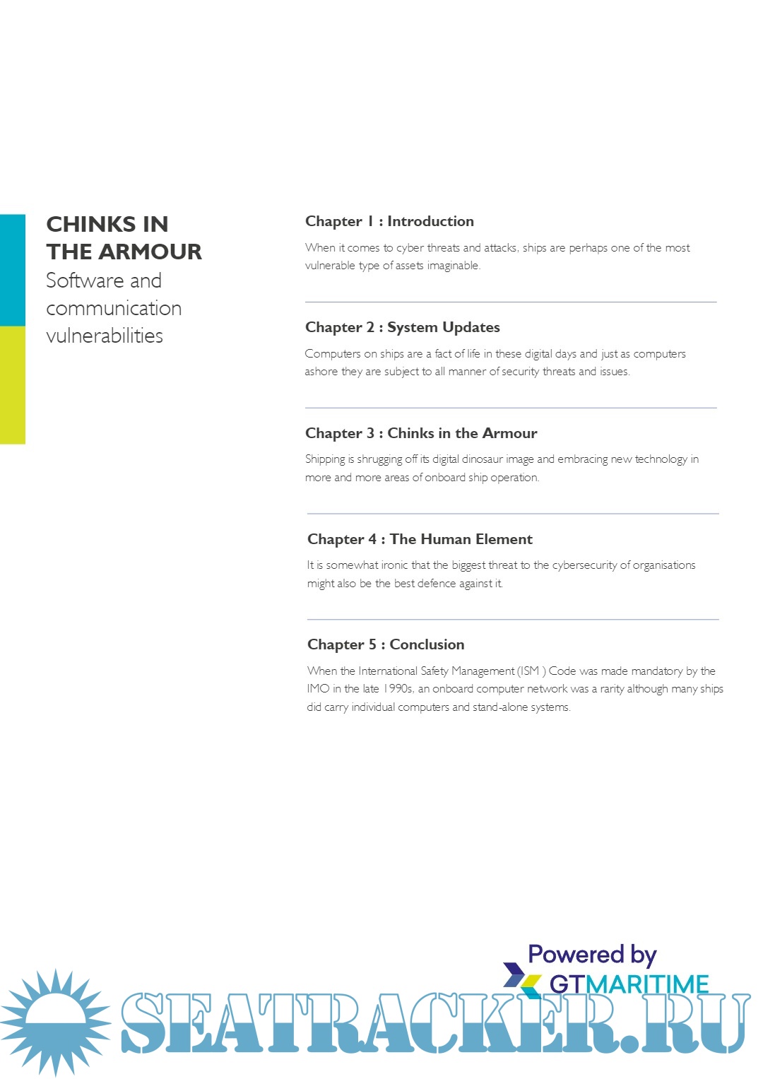 Year: 2023 Language: english Author: GT Maritime Genre: Guide Format: PDF Quality: eBook Pages count: 20 Description: This guide seeks to highlight some of the problems that can occur using equipment and operating systems likely to be found on ships in operation. As well as deliberate cyberattacks it considers how even supposedly safe and routine matters such as a system update can create difficulties on board a vessel. The question of automatic updating and its hazards is considered and also included in the guide is a section on the human element as this is the area where most failings can occur and where deliberate attackers most frequently target.