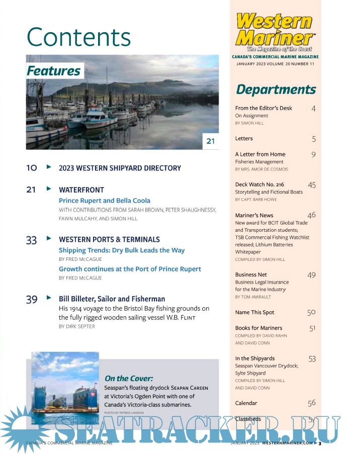 Year: 2023 Language: english Author: Somon Hill (Editor) Genre: Periodical (magazine) Edition: 2023-01 Format: PDF Quality: eBook Pages count: 64 Description: We reach more than 20,000 print and e-readers every month: vessel and fleet owners, boat builders and repairers, captains and crews on tugs, crew boats, ferries, workboats, fishing vessels and the businesses and people who support and supply them. Our writers and editors travel the coast to provide informative feature articles on the working waterfront. Our columnists offer insights into marine legal issues, ports and terminals, and entertainment and education for marine professionals.