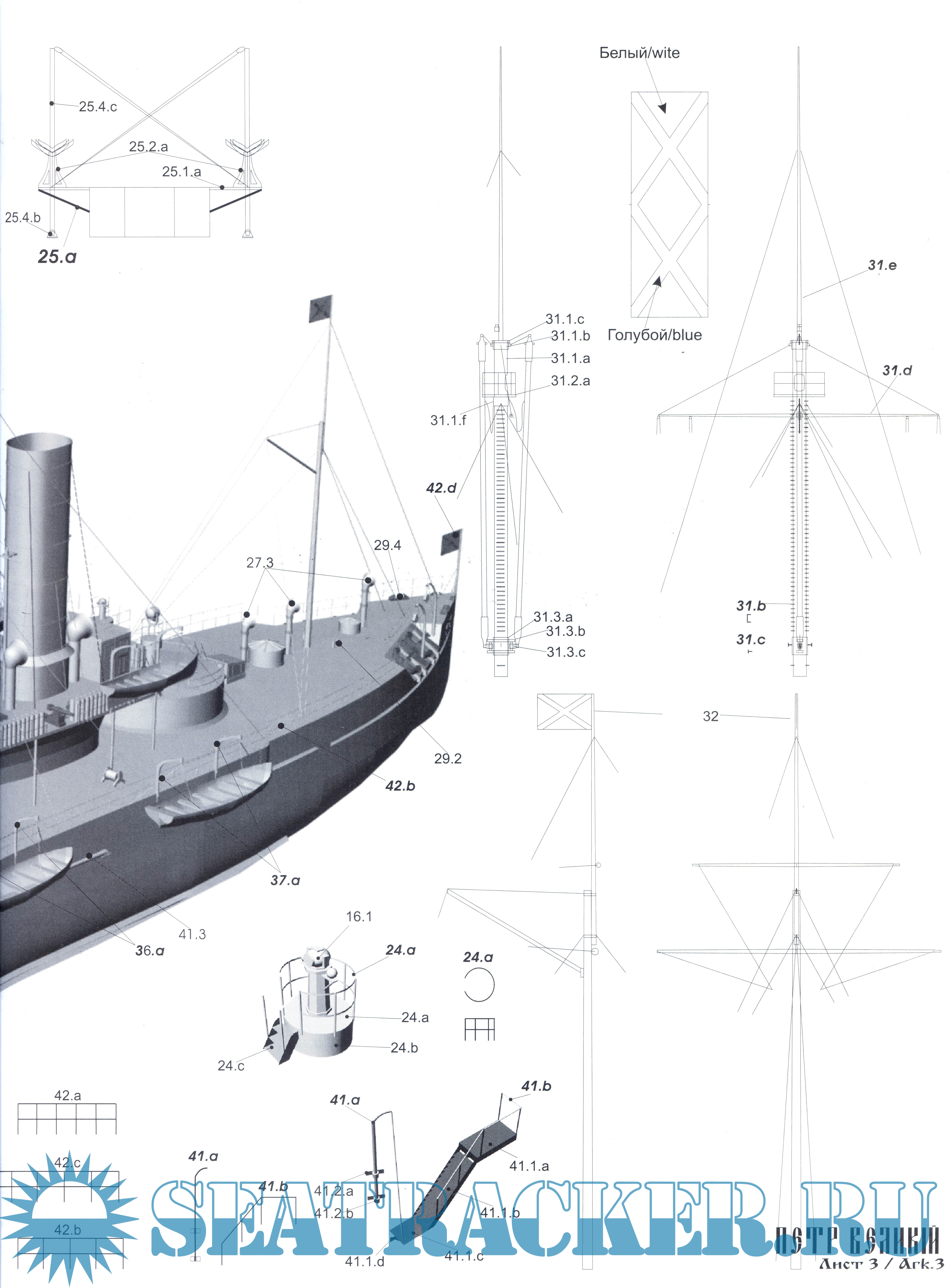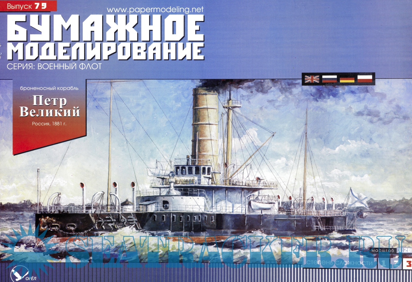 46 листов цветных выкроек и инструкций для изготовления бумажной модели броненосца "Петр Великий" Россия 1881 год в масштабе 1:200