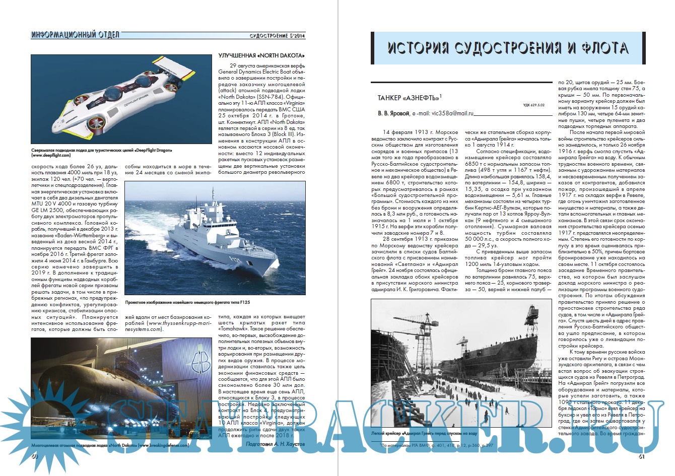 Описание: В журнале публикуются статьи ученых и специалистов на темы, связанные с проектированием, постройкой, ремонтом, модернизацией и утилизацией военных кораблей, гражданских судов. Регулярно выходят в свет работы, посвященные организации и технологии судостроительного производства, проектированию верфей и доков, новым судостроительным материалам. Большое внимание уделяется вопросам судовой энергетики и новым разработкам в области морской техники.