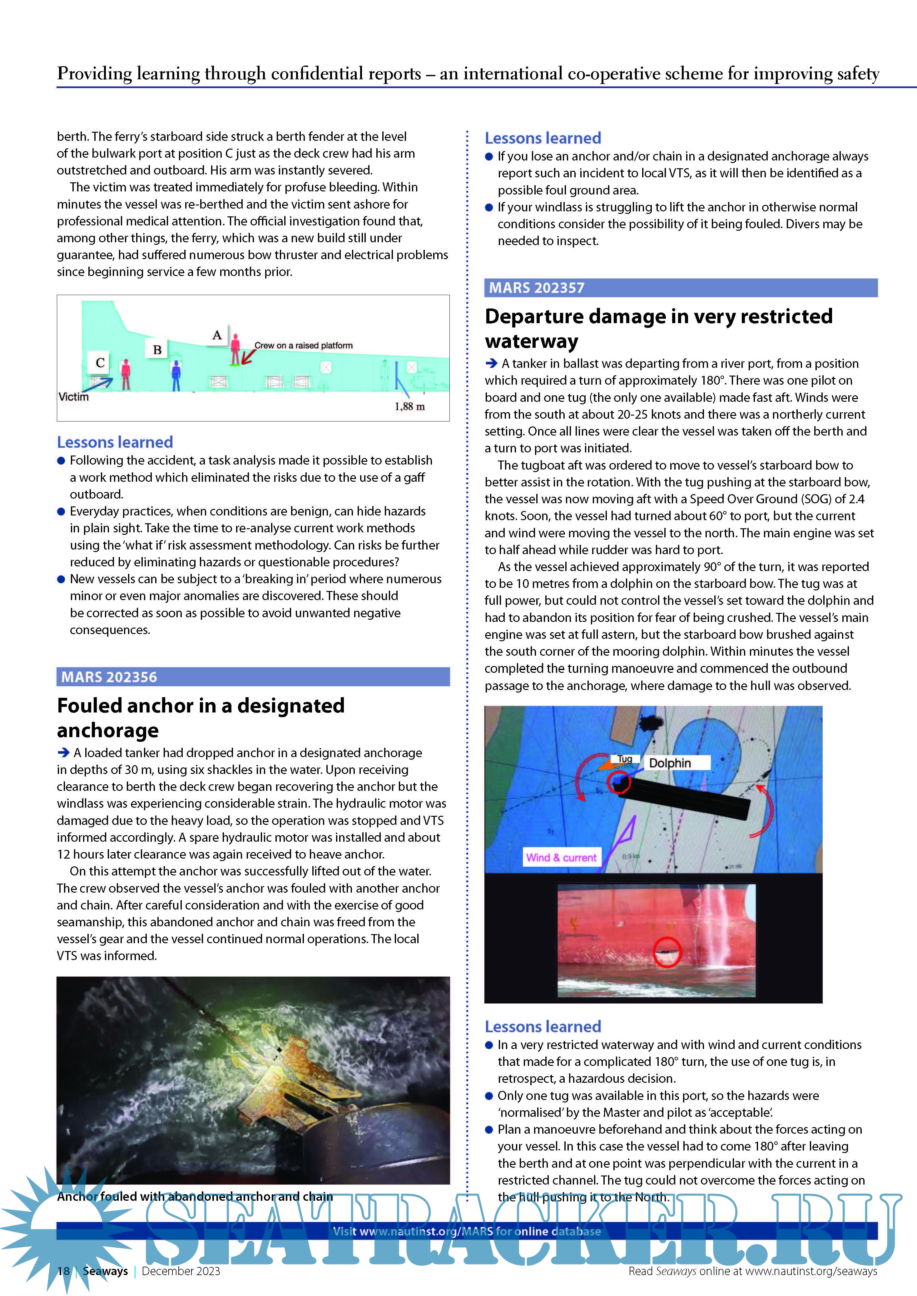 Year: 2023 Language: English Author: The Nautical Institute Genre: Periodical (magazine) Format: PDF Quality: eBook Pages count: 4 Description: MARS Report No.374 December, 2023 Providing learning through confidential reports – an international co-operative scheme for improving safety.MARS is a searchable database containing reports of accidents and near misses stretching back over a quarter of a century. Funded through the generous support of the Institute's Nautical Affiliate partners, it is one of the maritime industry's leading risk reduction initiatives and is helping to make life safer for seafarers everywher.