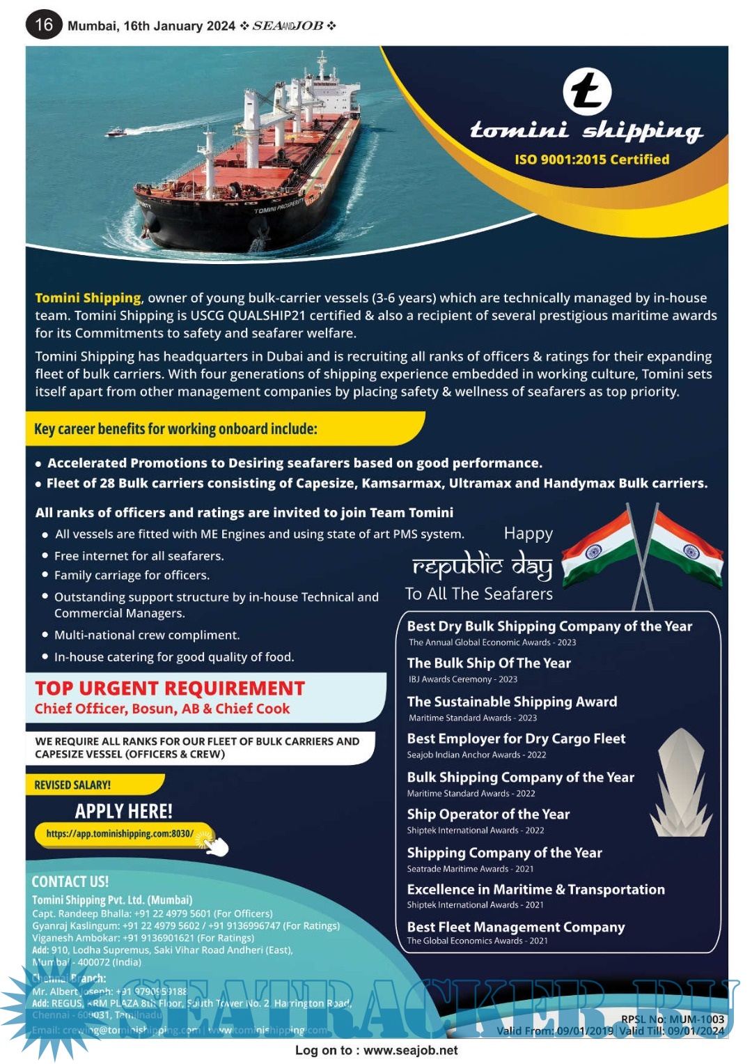 Description: The Sea and Job magazine launched in May 2007, was the second venture of Sea Line Group succeeding 'seajob.net' bringing the much renowned essence to the Group, the Sea and Job Magazine quickly gained popularity, becoming the No. 1 Shipping Magazine that came to be widely circulated all over India. Sea and Job over the years has evolved as the most trusted, ethical, objective and read maritime publication that possesses a large database of subscribers from various verticals in the industry.The magazine provides informative and interesting articles covering not just the shipping world but also the world outside it.Sea and Job is also a medium for the shipping/ manning companies to advertise marine jobs and also to promote their organization by publicizing internal activities like seminars, sports events and parties.Some notable endeavors of the magazine include the Know Your Recruiter Column, the Sailing Episodes Column and the Marine Insights section. The consistent efforts and the dedication to provide extraordinary services to the industry has resulted in the magnifying popularity and patronage of Sea and Job.