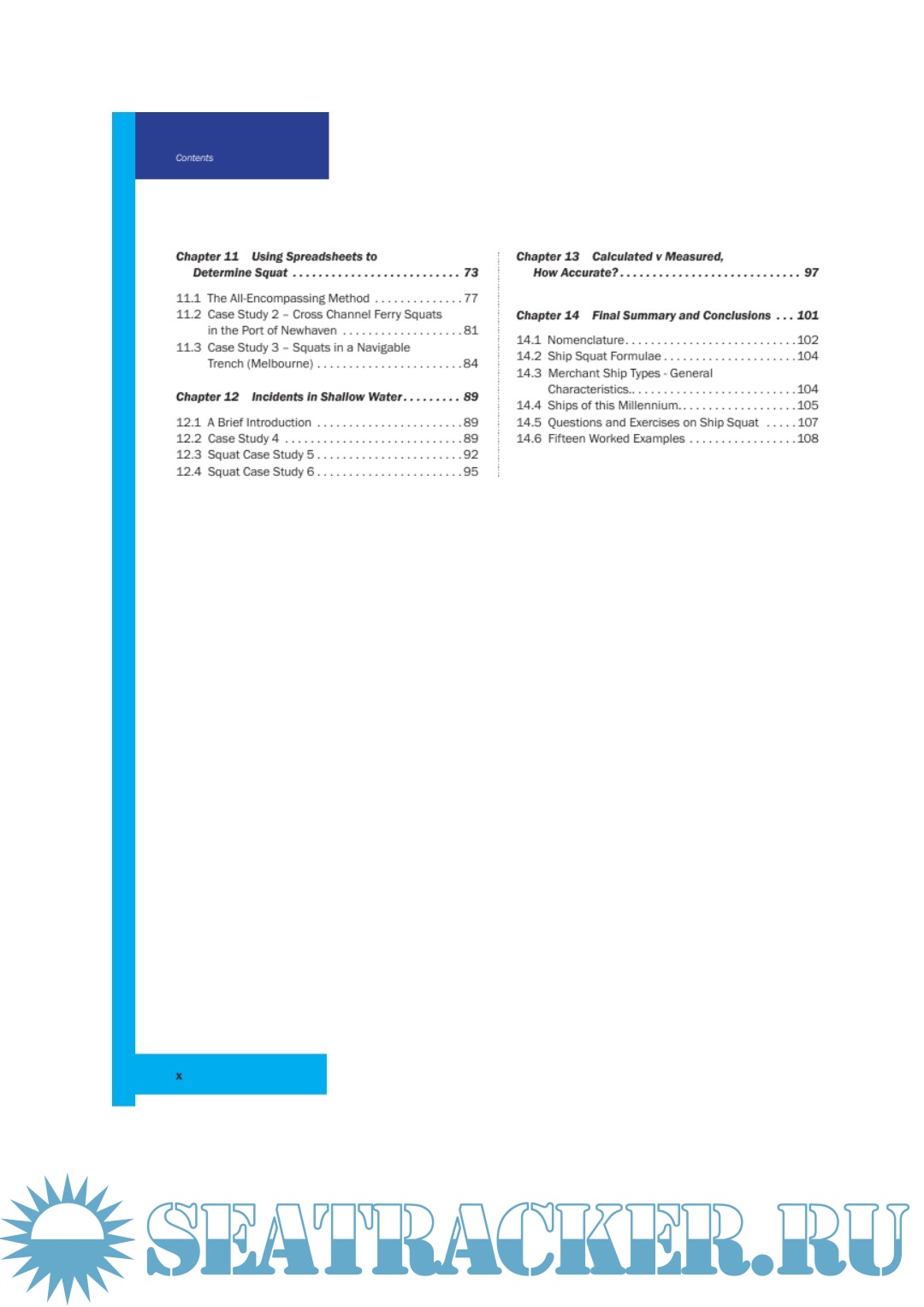 The first section of the book lists the signs that indicate when a ship has entered shallow water conditions. It describes methods of measuring squat and looks at the effect of speed on the squat value. Detailed guidance is provided on calculating squat and mean bodily sinkage, as well as the actions a ship can take to reduce squat. The guide provides 15 worked examples that guide the reader through each step of squat calculation.