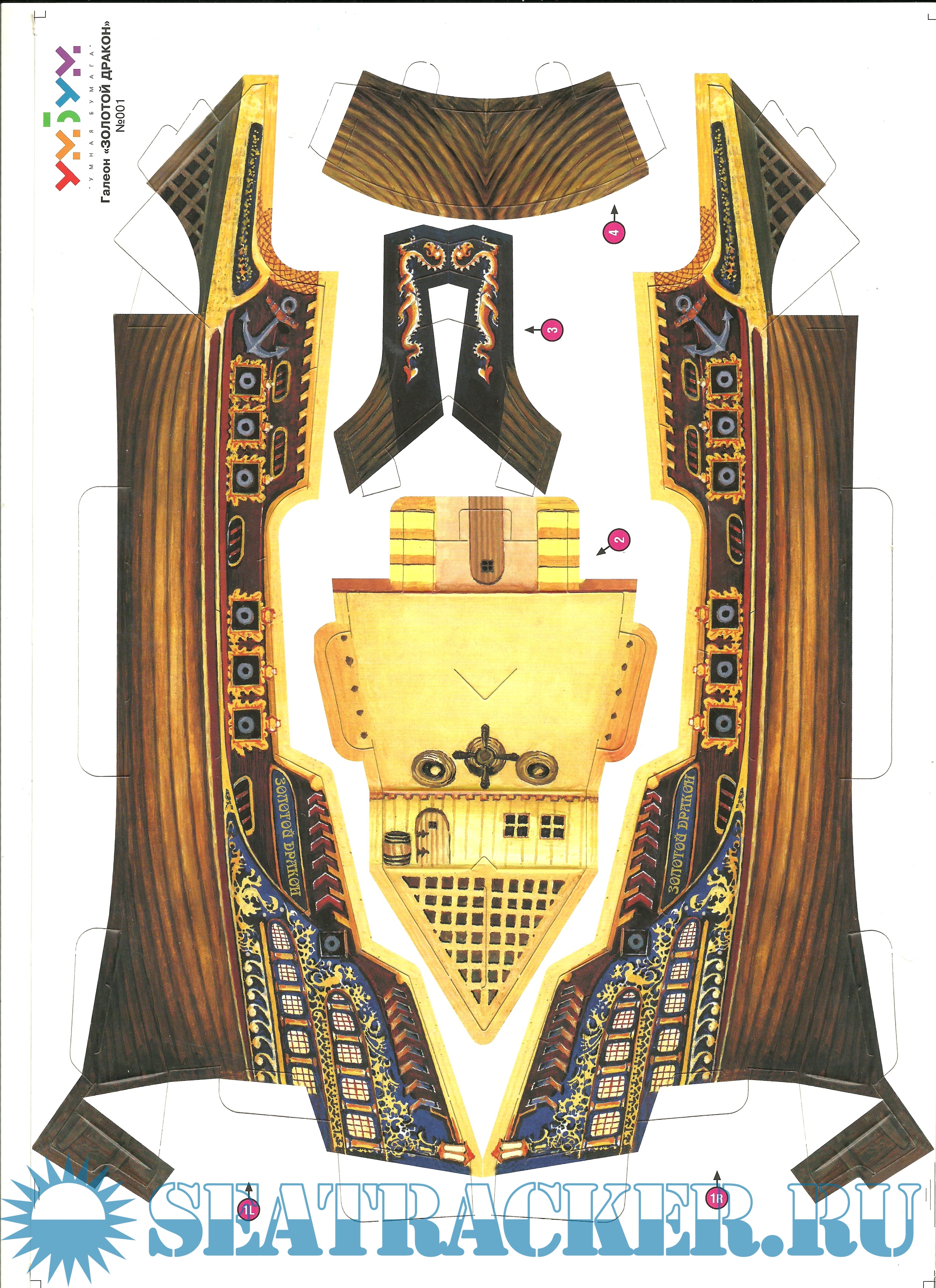 7 листов цветных выкроек и инструкций для изготовления бумажной модели галеона "Золотой дракон"