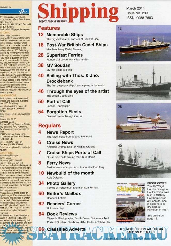 Description: Shipping T&Y is a monthly magazine for the shipping enthusiast offering up-to-date information, topical and in-depth historical articles alongside images, many of which are exclusive to the magazine.Shipping Today & Yesterday is a specialist magazine for the shipping enthusiast offering up-to-date information, topical and in-depth historical articles.Shipping Today & Yesterday was first produced in March 1990 by, the then Editor and Publisher, John Young. The first edition stated that it would, “offer a news service covering important developments in the Shipping industry Today and will look back at ships and events of Yesterday, with regular features on merchant ships