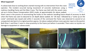 1 Unexpected Descent and Ascent of Mattress Lifting Frame 2 High potential: dropped chain assembly 3 Electrocution incident – make sure electrical equipment is safe! 4 Near miss with high pressure gas due to incorrect procedures 5 MSF: person injured falling between decks