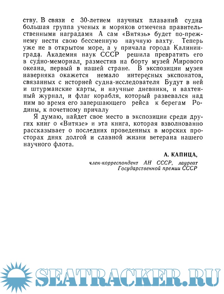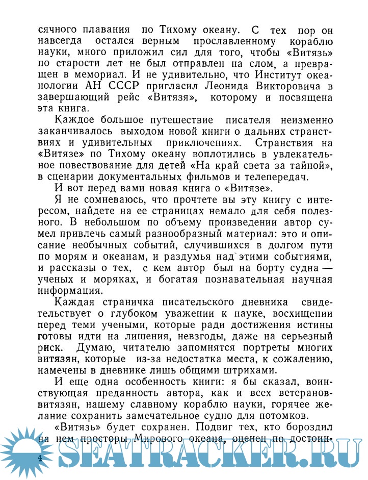 Год выпуска: 1981 Язык: русский Автор: Л.В.Почивалов Жанр: История Издательство: Знание Формат: PDF Качество: Отсканированные страницы Количество страниц: 114 Описание: Автор этих очерков участвовал в научных экспедициях на борту ветерана советского океанологического флота «Витязя». Изучая природу, раскрывая ее сокровенные тайны корабль науки бороздил самые глухие уголки Мирового океана, подходил к берегам далеких островов, исследовал максимальные глубины, загадочный «Бермудский треугольник», шел навстречу тайфунам и штормам. Эта книжка об увлекательных, но трудных и опасных научных путешествиях, о советских океанологах, их поисках и открытиях.