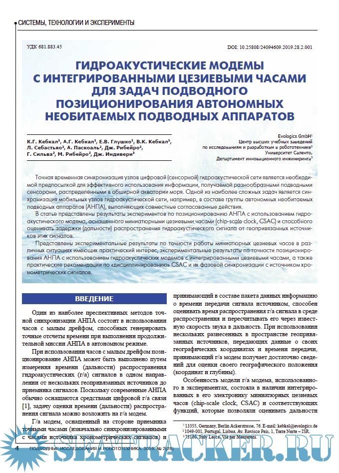 Гидроакустические модемы с интегрированными цезиевыми часами для задач подводного позиционирования автономных необитаемых подводных аппаратов