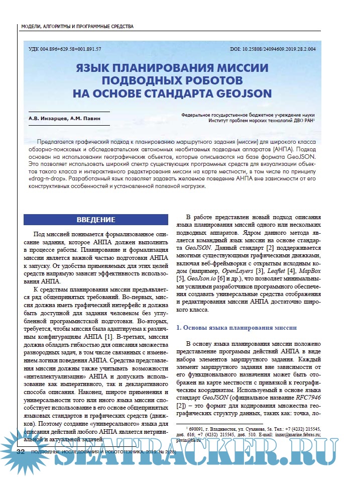 СОДЕРЖАНИЕ СИСТЕМЫ, ТЕХНОЛОГИИ И ЭКСПЕРИМЕНТЫ 4 Кебкал К.Г., Кебкал А.Г., Глушко Е.В., Кебкал В.К., Себастьяо Л., Паскоаль А., Рибейро Дж., Сильва Г., Рибейро М., Индивери Дж. Гидроакустические модемы с интегрированными цезиевыми часами для задач подводного позиционирования автономных необитаемых подводных аппаратов 13 Герасимов В.А., Красковский М.В., Филоженко А.Ю. Методика расчёта трансформатора с плоскими экранами для бесконтактной системы заряда аккумуляторных батарей подводного аппарата МОДЕЛИ, АЛГОРИТМЫ И ПРОГРАММНЫЕ СРЕДСТВА 23 Борейко А.А., Инзарцев А.В., Машошин А.И., Павин А.М., Пашкевич И.В. Система управления АНПА большой автономности на базе мультиагентного подхода 32 Инзарцев А.В., Павин А.М. Язык планирования миссии подводных роботов на основе стандарта GeoJSON 41 Данилов А.В., Кропотов А.Н. Применение метода «конечного поворота и смещения» для подводных манипуляционных роботов последовательной структуры со звеньями пантографного типа СРЕДСТВА И МЕТОДЫ ПОДВОДНЫХ ИССЛЕДОВАНИЙ 47 Тагильцев А.А., Безответных В.В., Моргунов Ю.Н., Стробыкин Д.С. Экспериментальное тестирование распределенной вертикальной автономной приемной системы 54 Щуров В.А., Ляшков А.С., Ткаченко Е.С., Щеглов С.Г. Особенности движения энергии низкочастотного сигнала в волноводе мелкого моря 62 Акуличев В.А., Буланов В.А., Бугаева Л.К. Влияние пузырьковых облаков в приповерхностном слое океана на затухание звука и структуру акустического поля 70 Рефераты