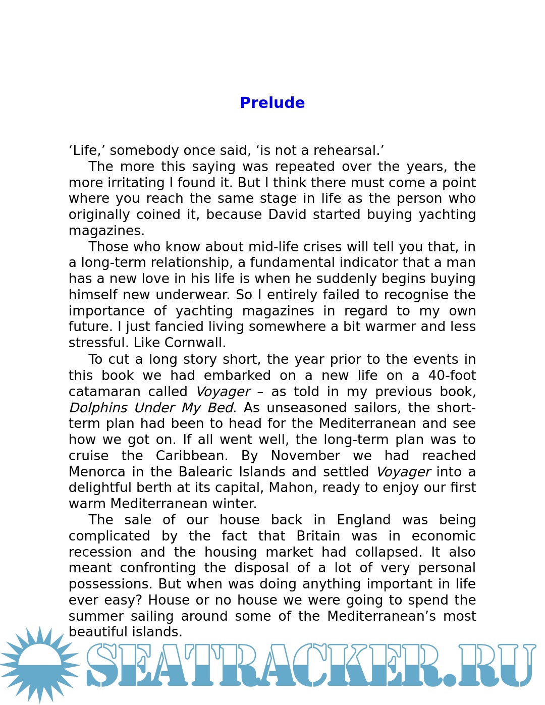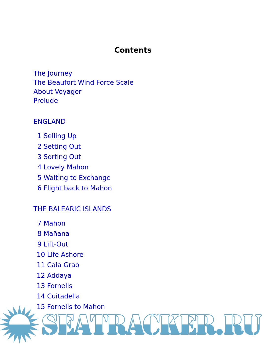 Year: 2012 Language: English Author: Clayton S. Genre: History Publisher: Adlard Coles ISBN: 1408152827 Format: PDF/EPUB Quality: eBook Pages count: 261 Description: Most people at some point long to escape - from the weather, the commute, the routine. Sailing off in a forty-foot boat called Voyager comes at a price, however. Indeed, for David and Sandra Clayton it meant selling their house and possessions with a lifetime's collection of memories and emotions attached to them. But the result proved life-enhancing. With her eye for detail and vivid descriptions, Sandra carries the reader with her through some of the Mediterranean's loveliest islands. Charmed by tranquil anchorages, ancient harbours and the people they meet, they also develop a fascination with the sea and its wildlife. And, whilst questioning the things we value and the nature of happiness, this book reveals the growing and sometimes amusing inter-dependence of two people alone at sea. This is the sequel to the popular Dolphins under my Bed, which charted Sandra and David's first long journey: a 2,000-mile voyage from England, down the Atlantic coast and into the warm waters of the Mediterranean.