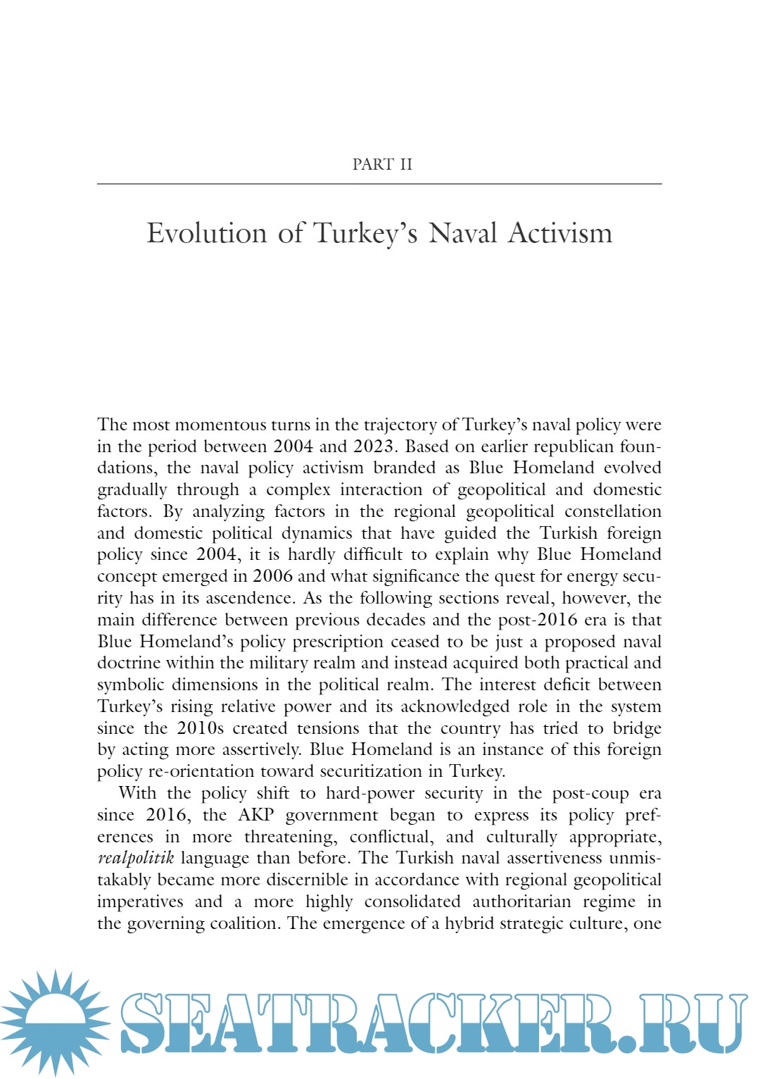 Description: This book explores the significance of Turkey’s Blue Homeland (Mavi Vatan) naval concept through the lens of neoclassical realism by investi-gating the impact of geopolitics and domestic political factors on foreign policy outcomes. It uncovers motivations behind the policy change between 2004 and 2023 with a particular focus on the last seven years, the period when Turkey’s naval assertiveness reached its peak following the failed coup attempt in 2016. The argument highlights that Blue Home-land is an extension of Turkey’s national self-conception embodied in the Vatan concept; it is the manifestation of a traditional land power claiming its place as an emergent maritime power. The Justice and Development Party (AKP) government led by President Recep Tayyip Erdo˘gan has rein-forced an activist maritime policy since 2016 due to pressures of regional insecurity, domestic coalition logrolling, and nationalist sentiment.