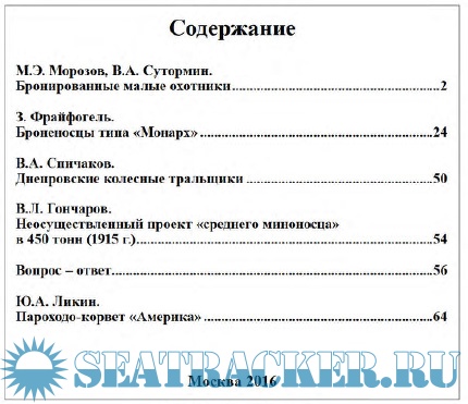 Центральный материал номера - статья историка хорватского происхождения Звонимира Фрайфогеля (Zvonimir Freivogel, Германия) об австро-венгерских броненосцах типа «Монарх». Перевод выполнил Леонид Анатольевич Олюнин (г. Котельнич Кировской обл.). Использована графика Станислава Шупика (Stanislav Supik) и Даниеля Фрка (Danijel Frka), предоставленная автором. Редакция выражает благодарность Н.В. Митюкову за помощь в подготовке материала к публикации.