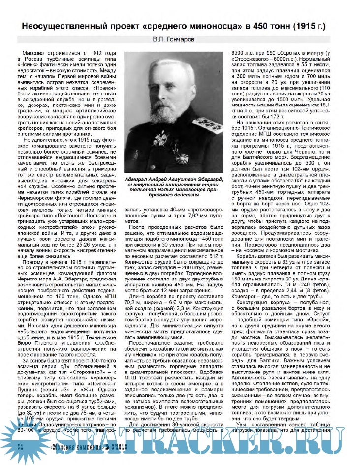 Владислав Львович Гончаров (Санкт-Петербург) на основе материалов РГА ВМФ раскрывает историю неосуществленного проекта 450-тонного миноносца прибрежного действия, разрабатывавшегося в годы Первой мировой войны.