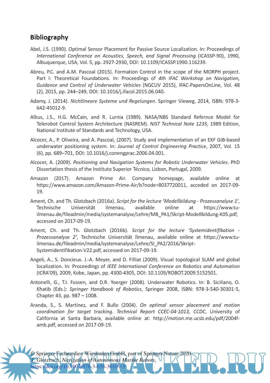 Year: 2020 Language: English Author: Thomas Glotzbach Genre: Research papers Publisher: Springer Vieweg ISBN: 978-3-658-30108-8 Format: PDF Quality: eBook Pages count: 392 Description: Thomas Glotzbach spotlights that navigation within marine robotics can benefit from cooperative teams in a way that justifies the increased effort to operate several vehicles at once. He features discussions of different scenarios, modeling of systems, and estimation algorithms for comparable situations. The chapter on the used methodologies may allow a reader with only basic knowledge in control theory to obtain deeper insight in advanced concepts such as observability and state estimation, even without any background in marine robotics. Contents • Navigation in Marine Robotics: Methods, Classification, and State of the Art • Problem Formulation and Definitions • Mathematical Tools from Control and Systems Engineering • Methods for Cooperative Navigation • Optimal Sensor Placement in Marine Robotics • Combination of Cooperative Navigation and Optimal Sensor Placement Target Groups • Researchers and students in the fields of automation, control systems, electrical and computational engineering • Practitioners in marine robotics, mobile systems The Author Dr. Thomas Glotzbach obtained experience in maritime robotics as researcher at Technische Universität Ilmenau, Germany (doctoral and habilitation degree) and at Instituto Superior Técnico, Lisbon, Portugal. Since September 2019, he has been Professor of Control Engineering and Robotics at Technische Hochschule Mittelhessen – University of Applied Sciences, Germany.